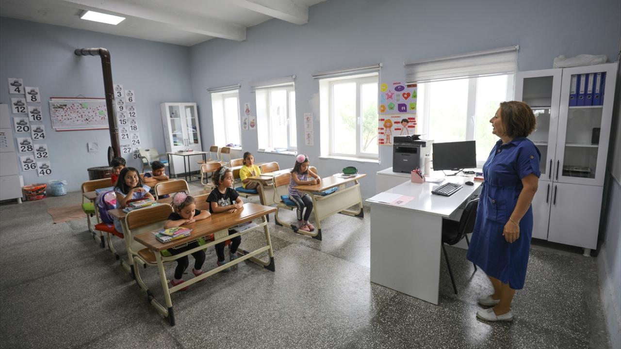Okuldaki 5 anasınıfı ve 5 ilkokul öğrencisi, karnelerini öğretmenlerinden alarak yaz tatiline girdi.