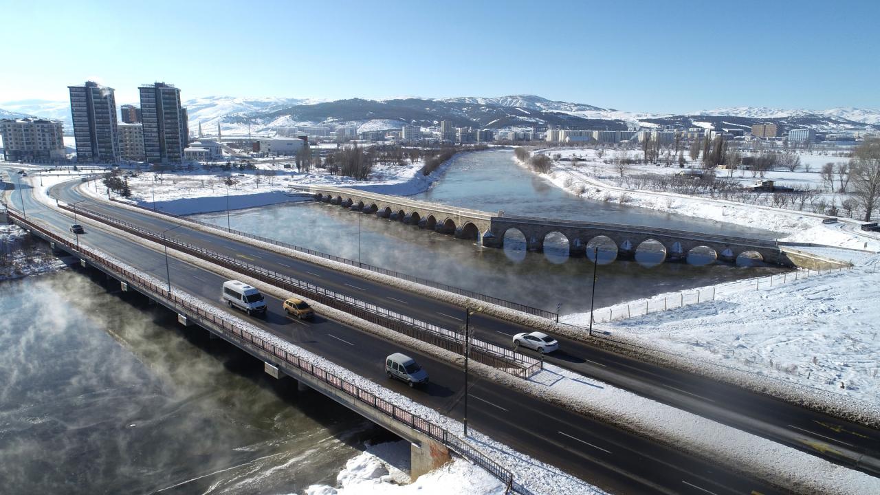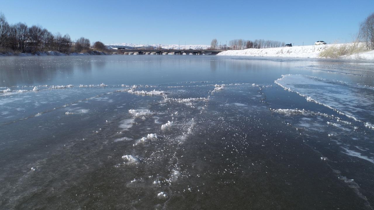 Özellikle akıntının az olduğu bölümlerin tamamen donduğu görüldü. Kardeşler Mahallesi`ndeki tarihi Eğri Köprü`nün üst bölümünde nehir buzla kaplandı.