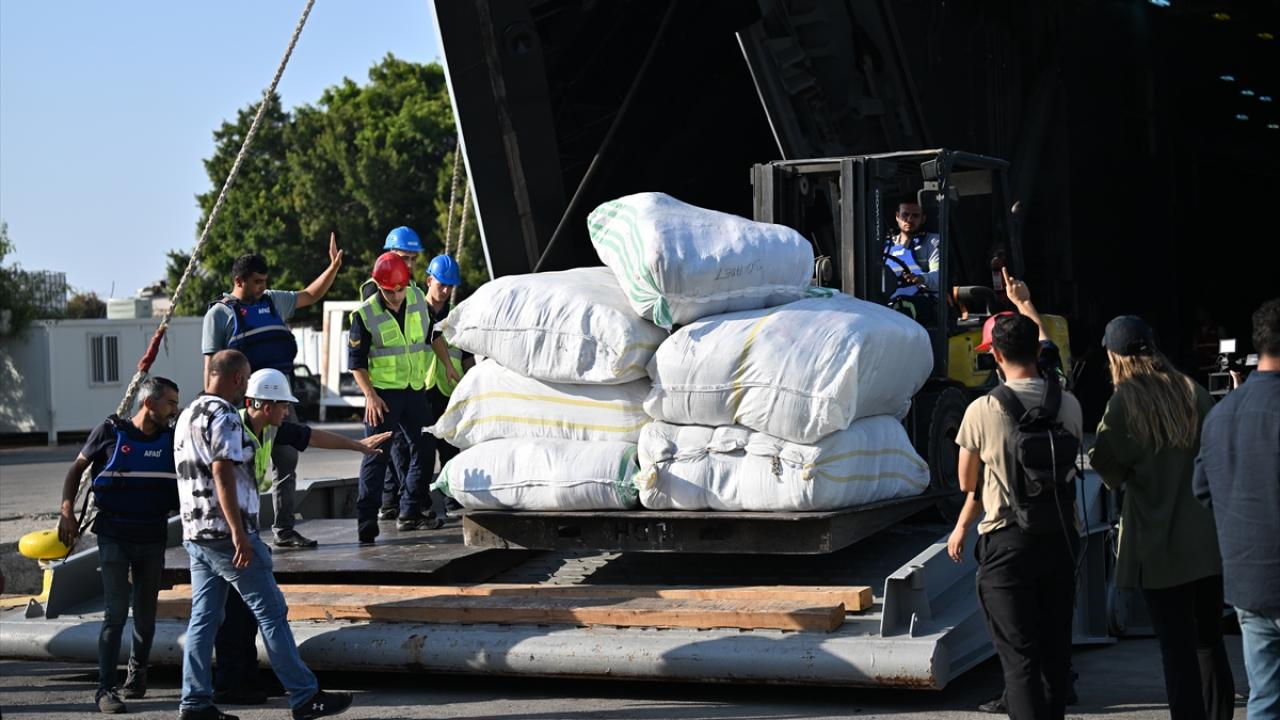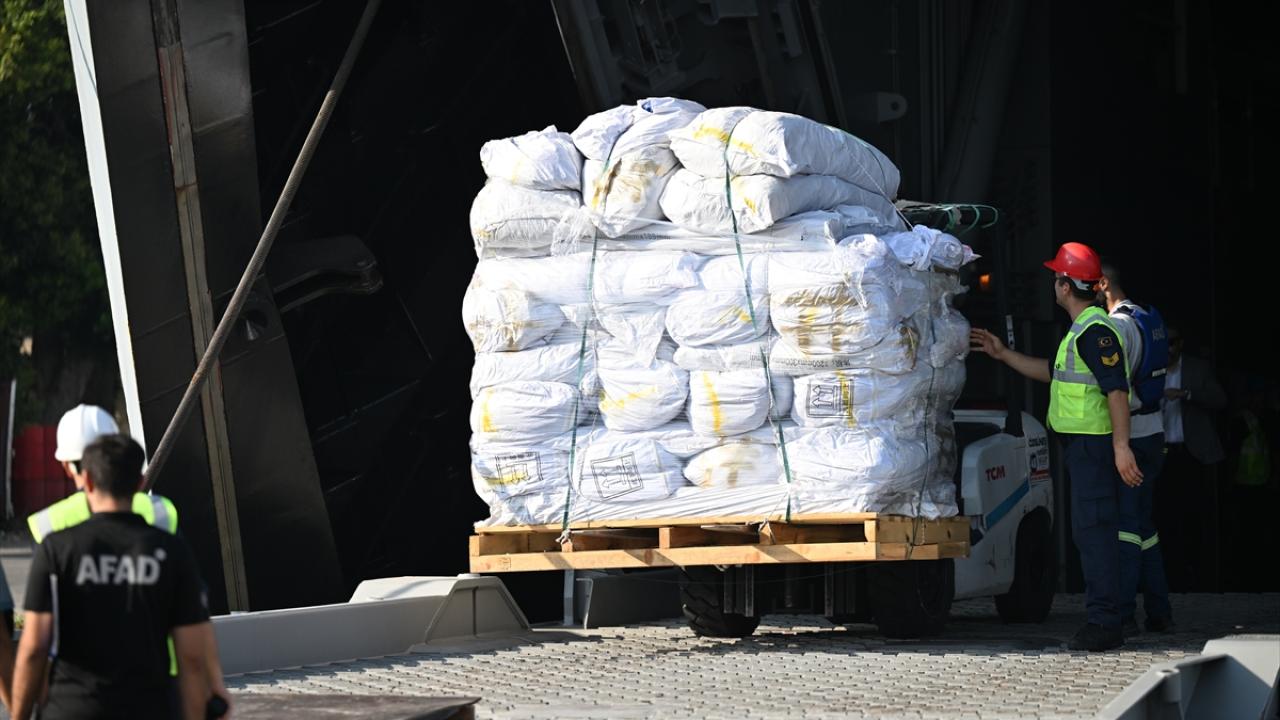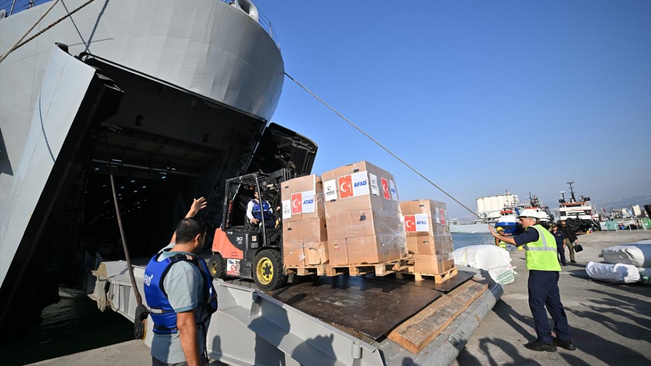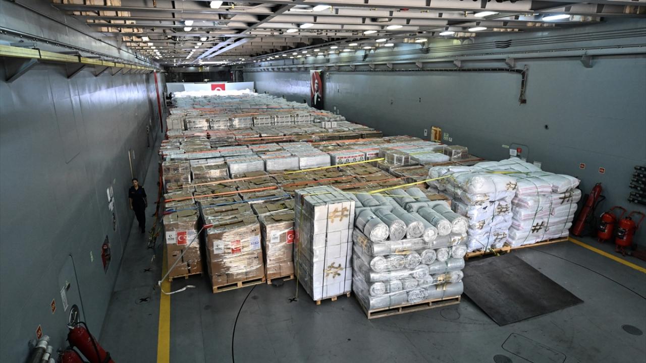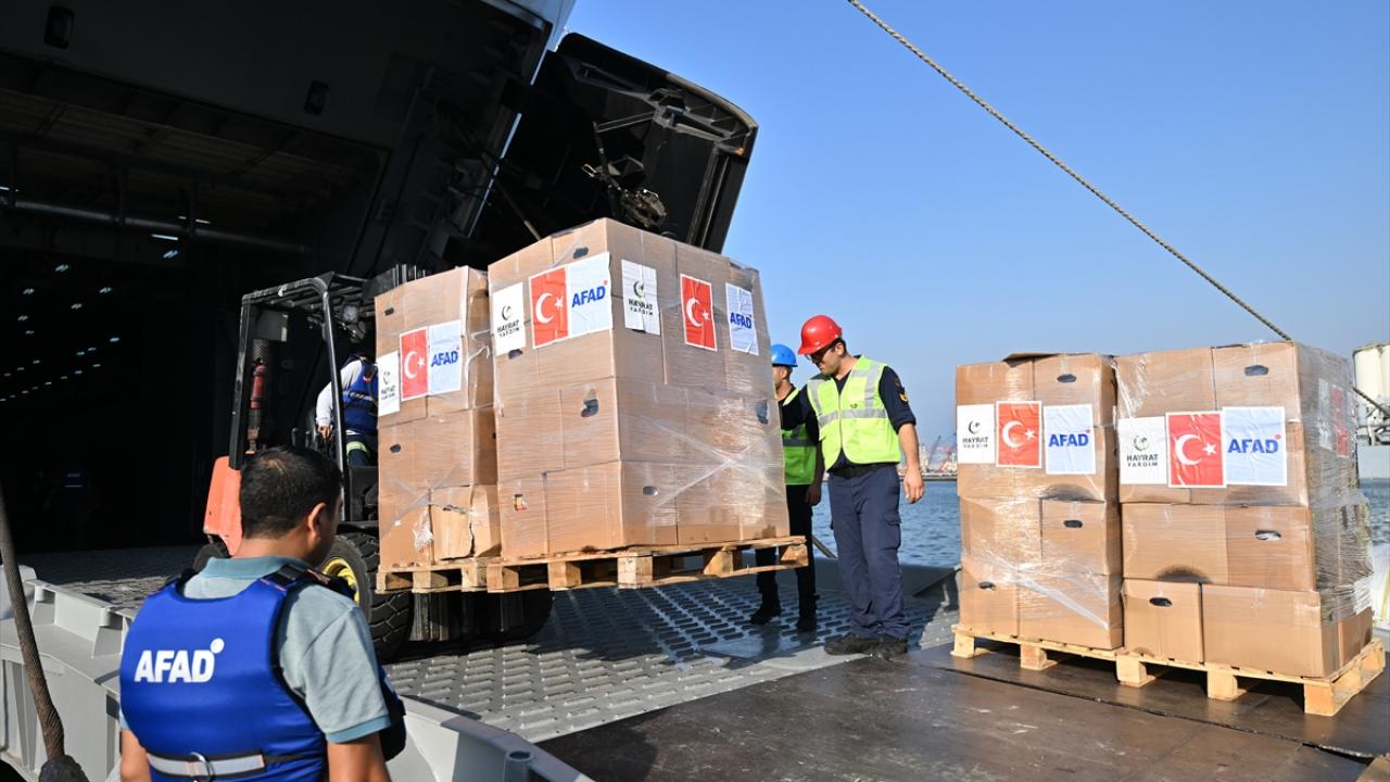 AFAD koordinesinde toplanan gıda, battaniye ve çadırdan oluşan 300 ton insani yardım malzemesi, Mersin`de Sahil Güvenlik Akdeniz Bölge Komutanlığı`ndaki amfibi gemiler TCG Sancaktar ve TCG Bayraktar`a yüklendi.