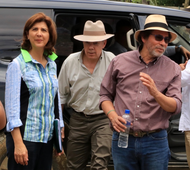 Türk İşbirliği ve Koordinasyon Ajansı Başkanlığı (TİKA) tarafından Kolombiya`da, Briceno kenti kırsalındaki Orejon mezrasına yaptırılan okulun açılışına Kolombiya Devlet Başkanı Juan Manuel Santos, (Ortada) Dışişleri Bakanı Maria Angela Holguin (Solda) ve TİKA Bogota Program Koordinatörü Doç. Dr. Mehmet Özkan (Sağda) katıldı.