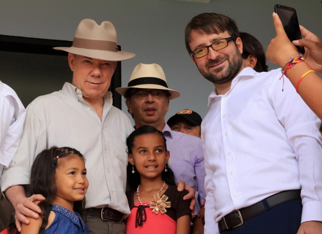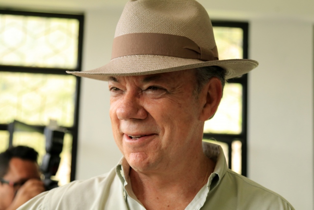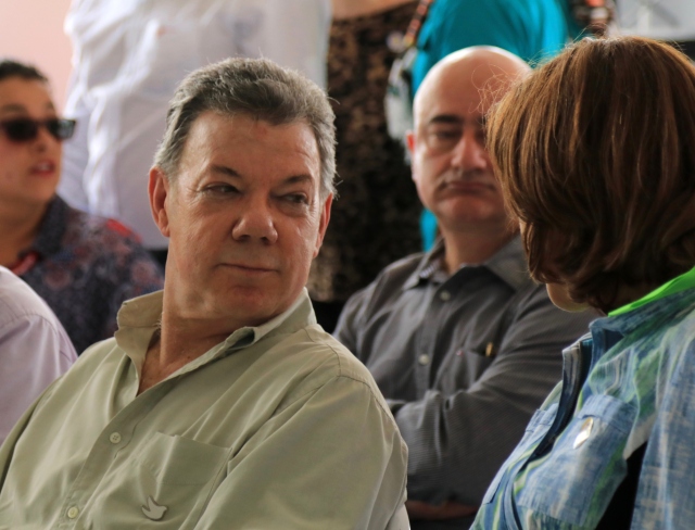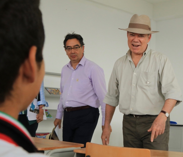 Kolombiya Devlet Başkanı Juan Manuel Santos (Sağda) ve Türkiye`nin Bogota Büyükelçisi Engin Yürür, (Solda) Türk İşbirliği ve Koordinasyon Ajansı Başkanlığı (TİKA) tarafından Kolombiya`da, Briceno kenti kırsalındaki Orejon mezrasına yaptırılan okulu gezdi.