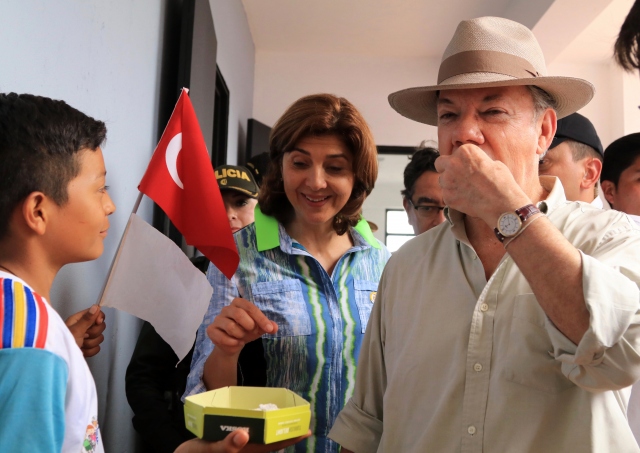 Türk İşbirliği ve Koordinasyon Ajansı Başkanlığı (TİKA) tarafından Kolombiya`da, Briceno kenti kırsalındaki Orejon mezrasına yaptırılan okulun açılışında, Kolombiya Devlet Başkanı Juan Manuel Santos`a lokum ikram edildi.