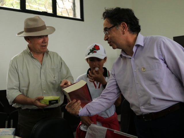 Kolombiya Devlet Başkanı Juan Manuel Santos, (Solda) Türkiye`nin Bogota Büyükelçisi Engin Yürür (Ortada) ve Türk İşbirliği ve Koordinasyon Ajansı Başkanlığı (TİKA) Bogota Program Koordinatörü Doç. Dr. Mehmet Özkan, TİKA tarafından Kolombiya`da, Briceno kenti kırsalındaki Orejon mezrasına yaptırılan okulu gezdi.