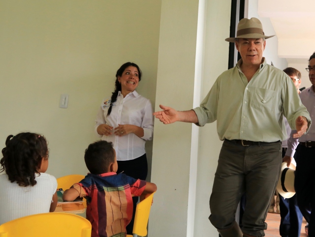 Türk İşbirliği ve Koordinasyon Ajansı Başkanlığı (TİKA) tarafından Kolombiya`da, Briceno kenti kırsalındaki Orejon mezrasına yaptırılan okulun açılışına katılan Kolombiya Devlet Başkanı Juan Manuel Santos çocuklarla sohbet etti.