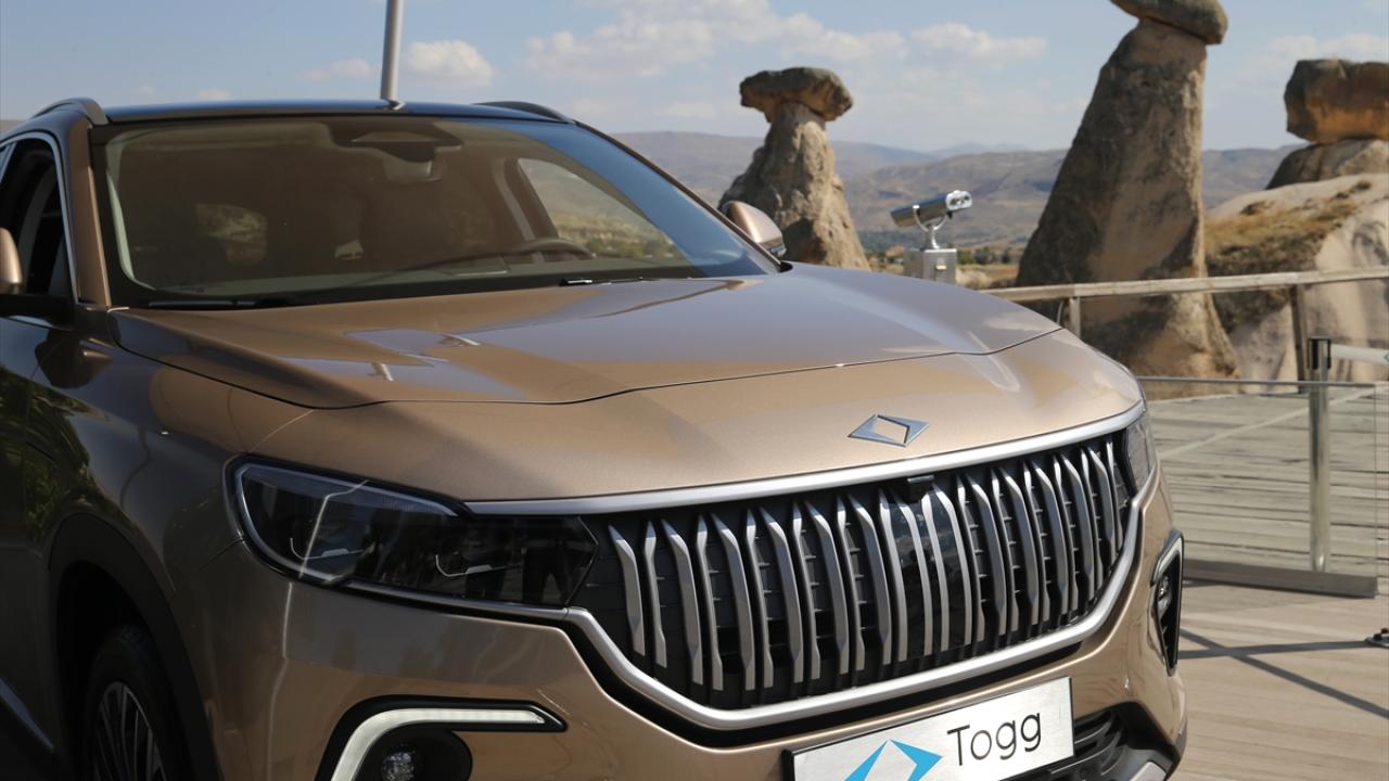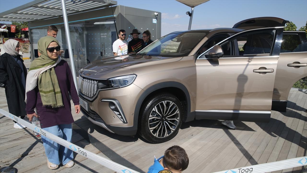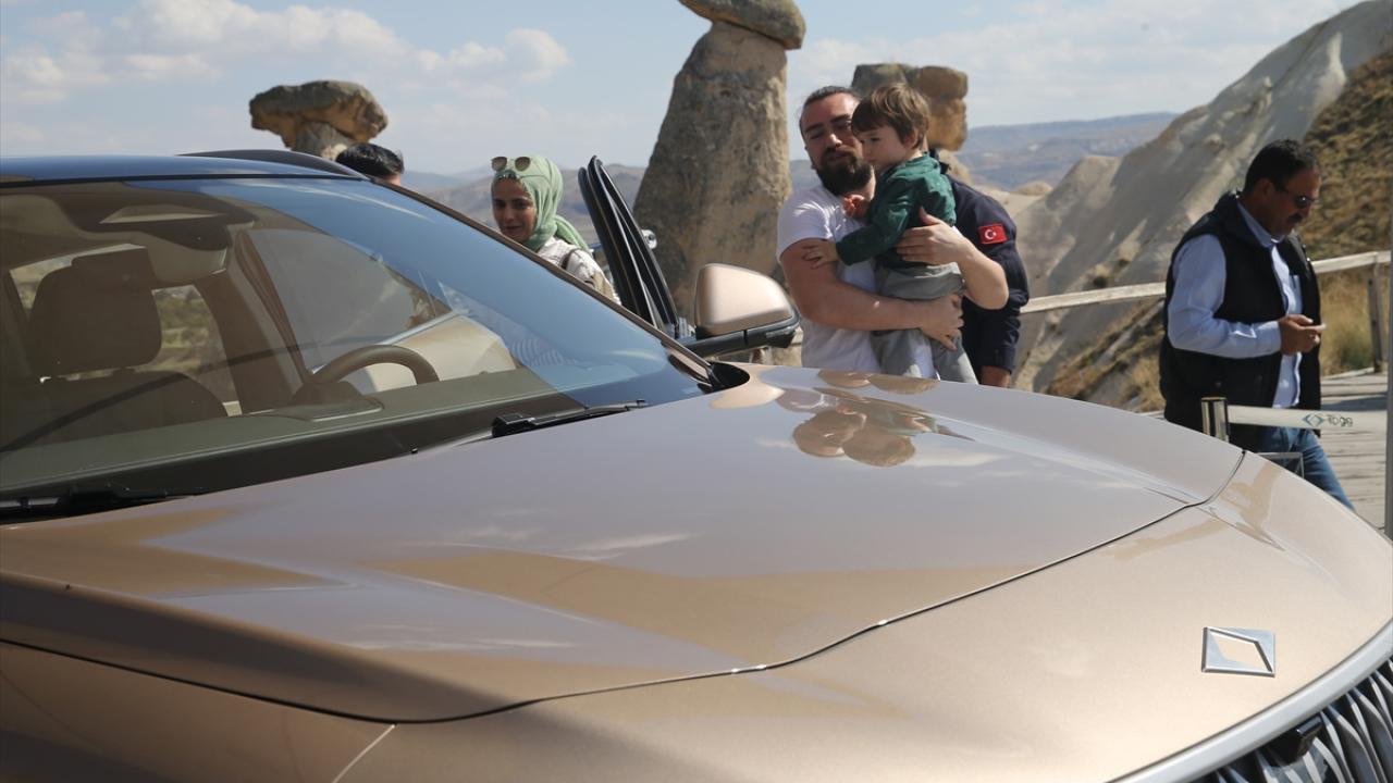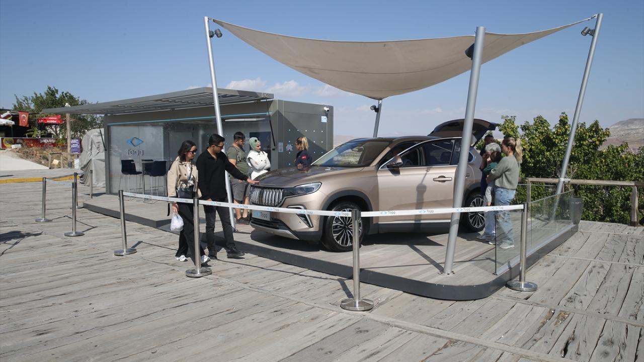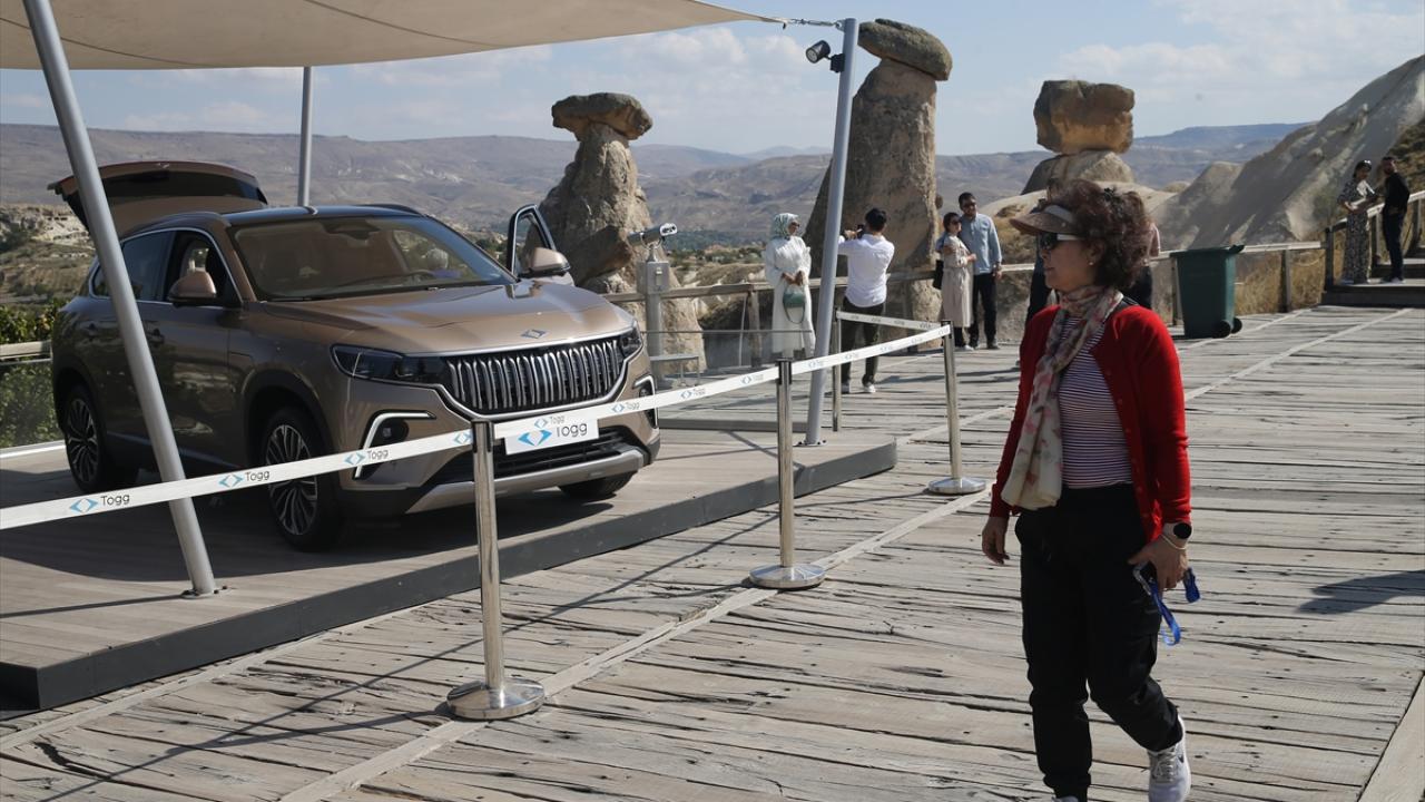 Üç Güzeller mevkisinde, peribacalarının bulunduğu alana getirilen "Kapadokya" renkli Togg T10X, vatandaşların beğenisine sunuldu.