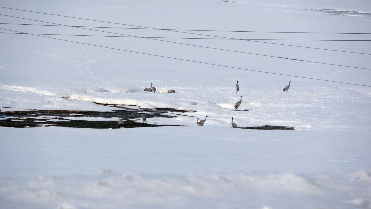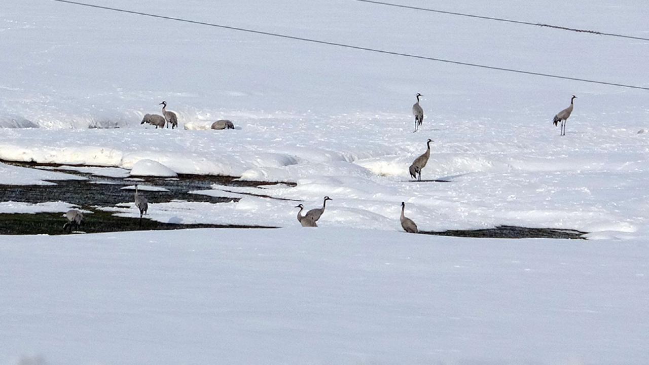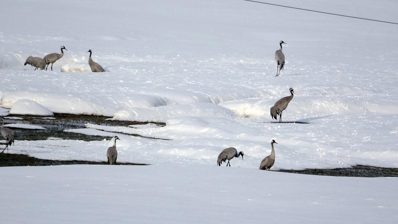 Her sene olduğu gibi yine göç yoluyla gelen onlarca kuş türünden biri olan turna, ovada bulunan kar üzerinde sürü halinde görüntülendi.