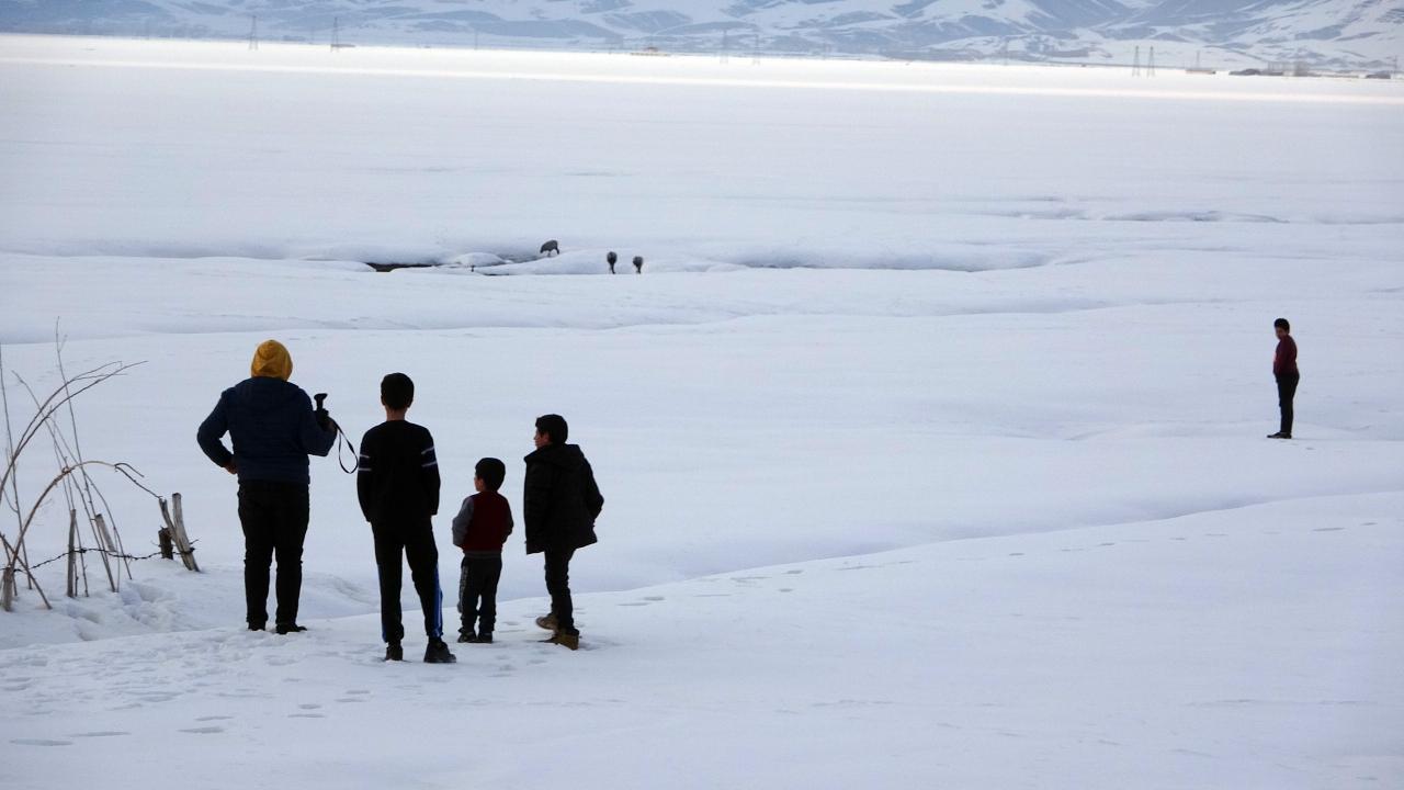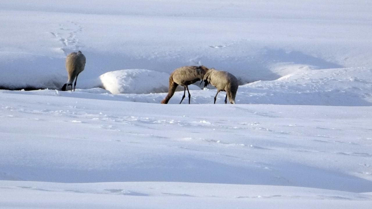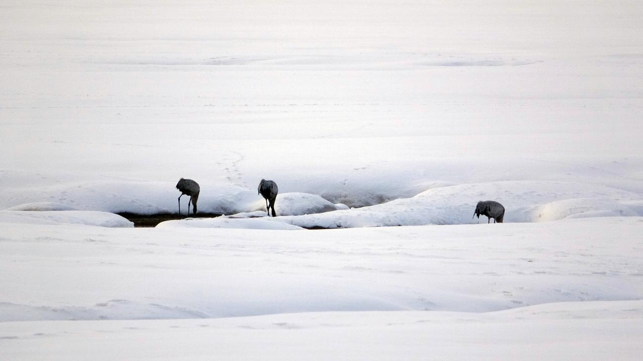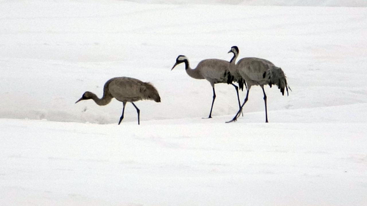 Her sene olduğu gibi yine göç yoluyla gelen onlarca kuş türünden biri olan turna, ovada bulunan kar üzerinde sürü halinde görüntülendi.