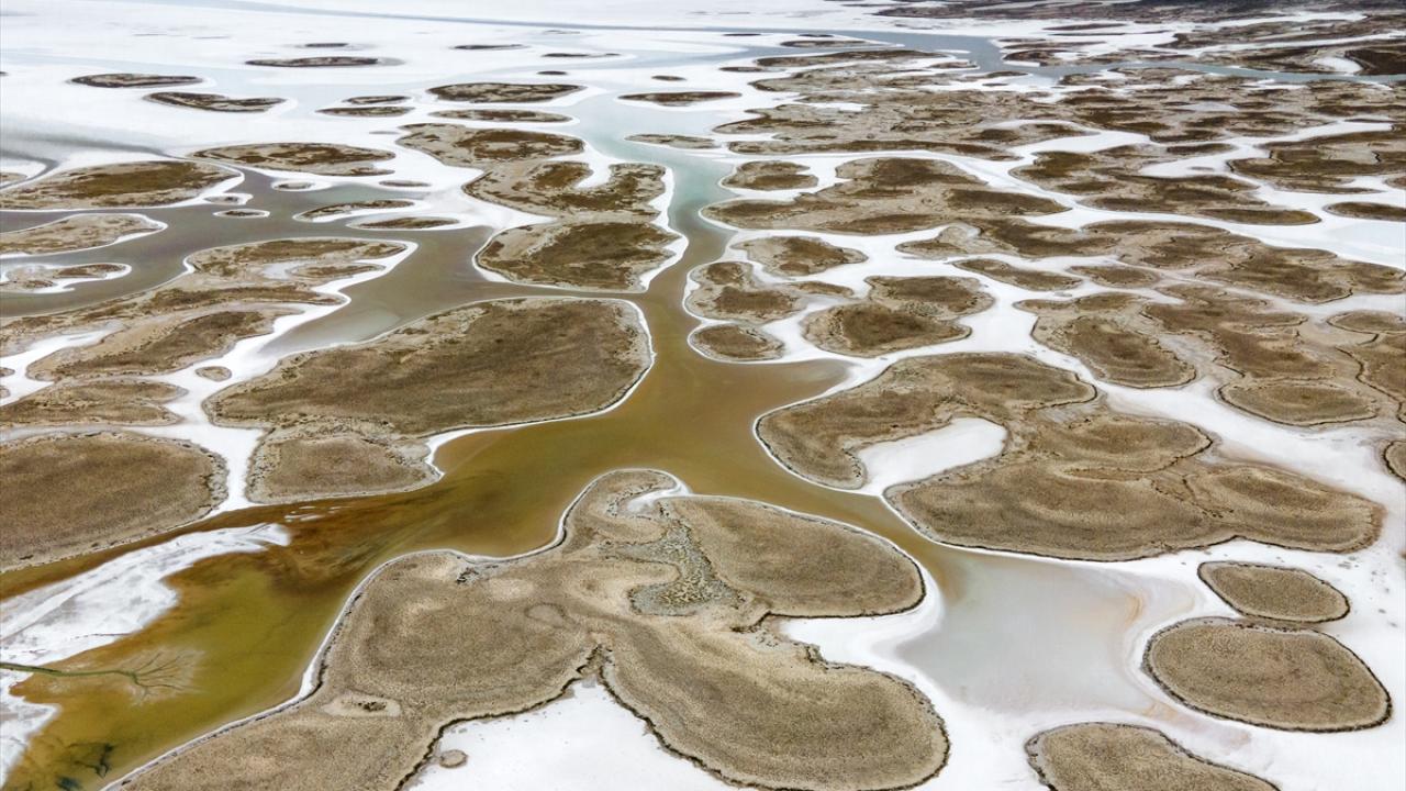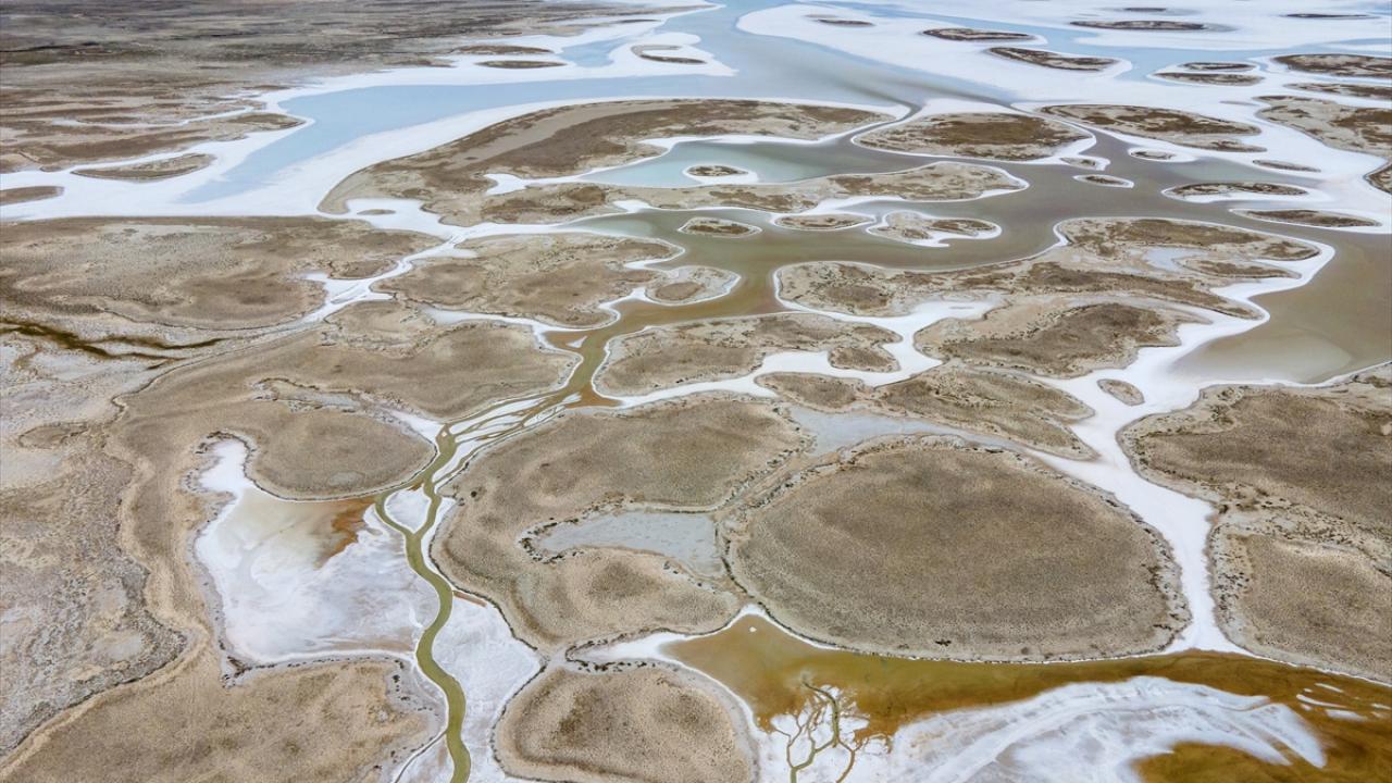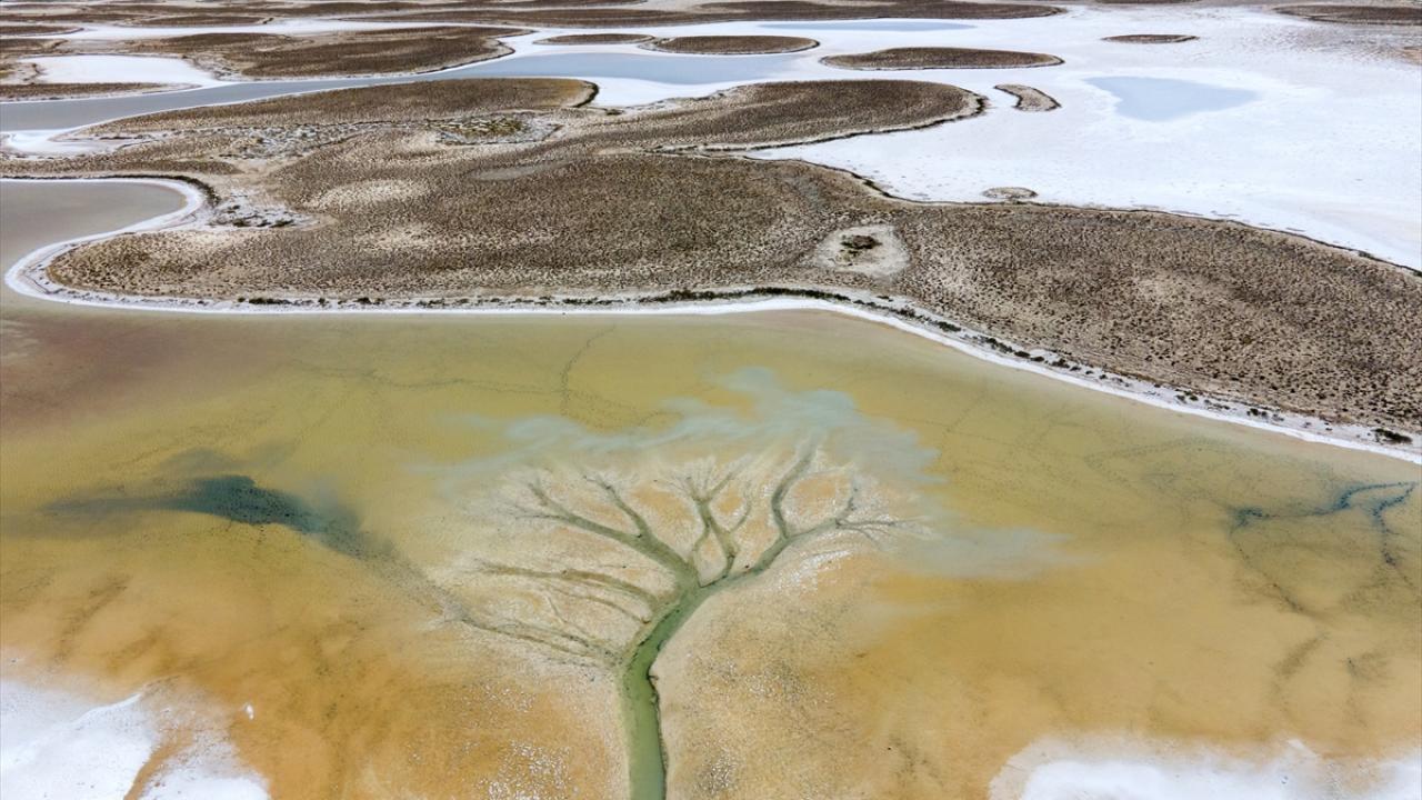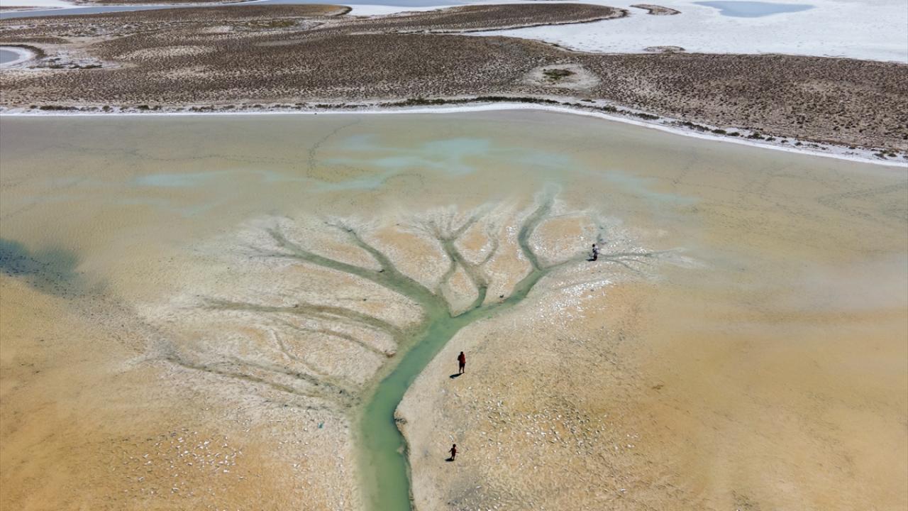 Su seviyesinin düşmesiyle kuraklığın yaşandığı göl havzasında oluşan şekiller görüntülendi.