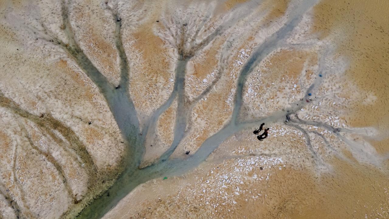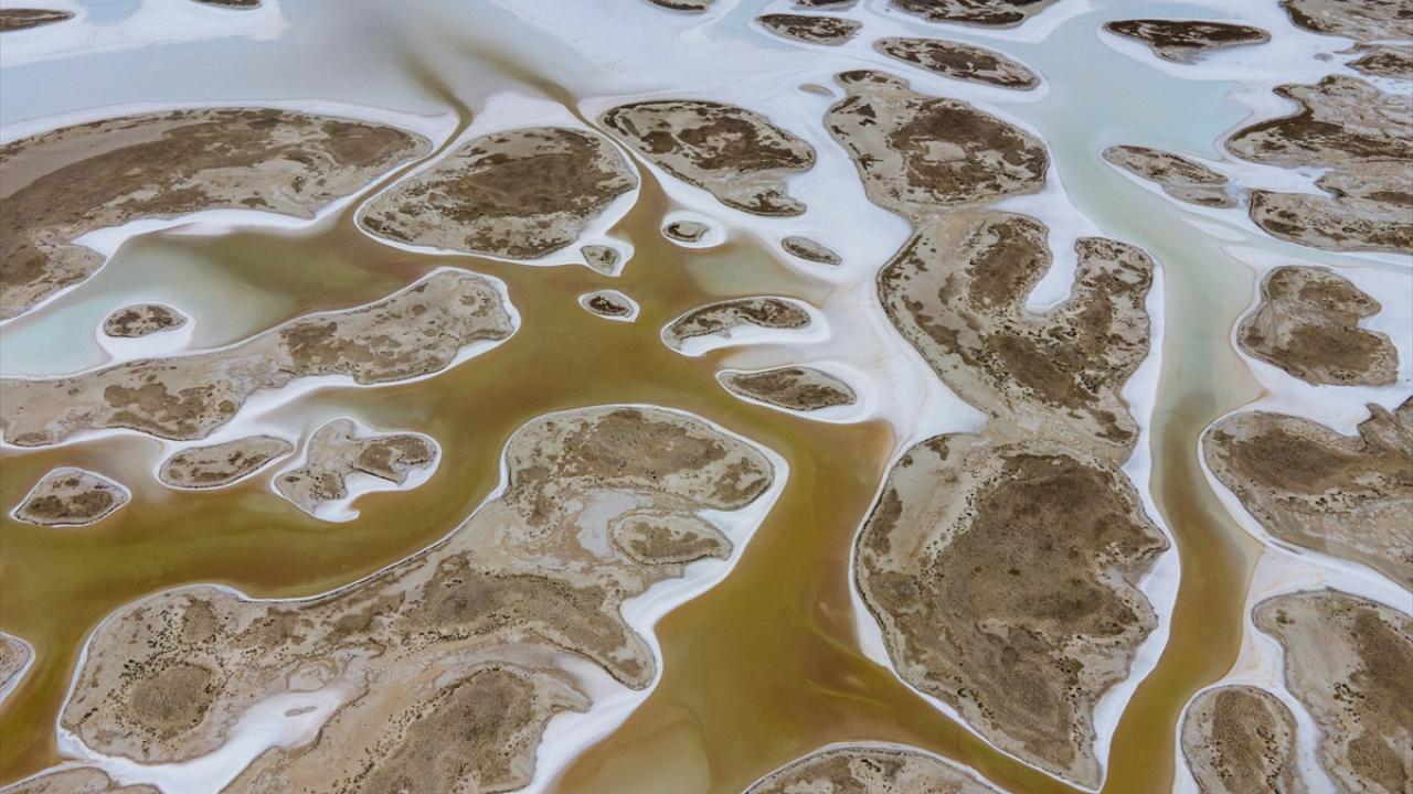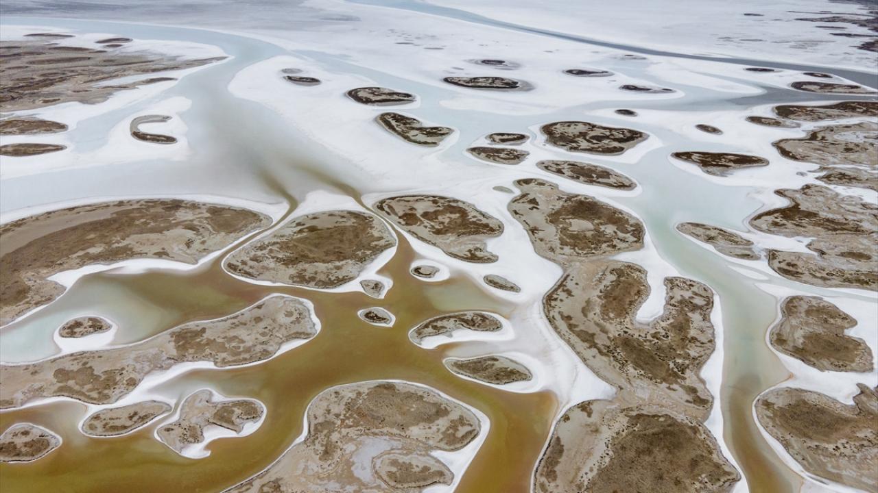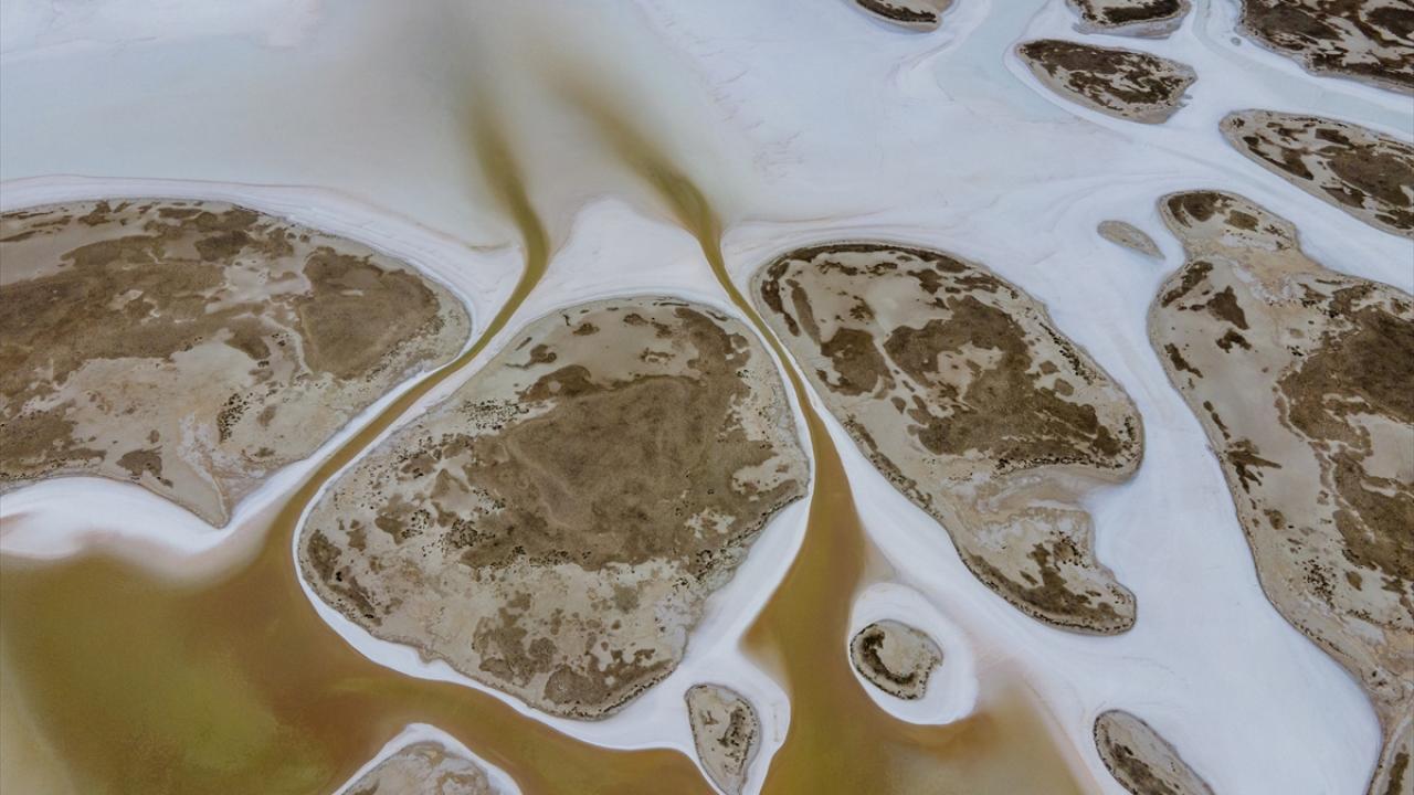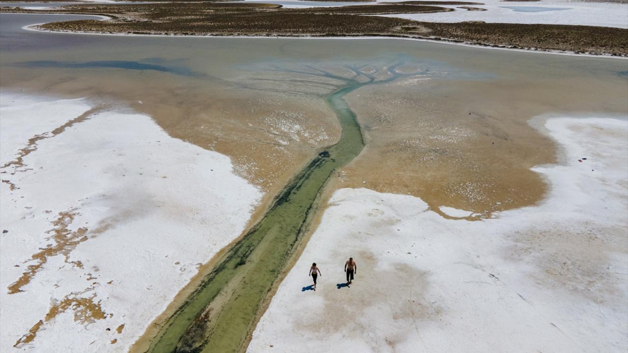 Su seviyesinin düşmesiyle kuraklığın yaşandığı göl havzasında oluşan şekiller görüntülendi.