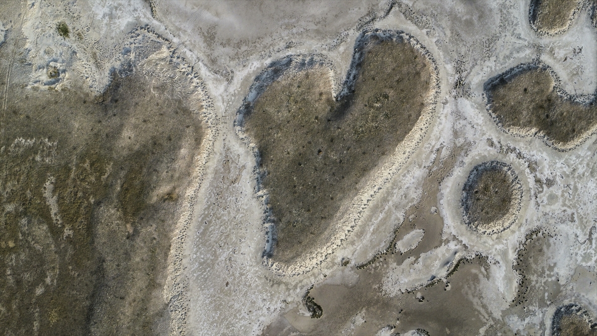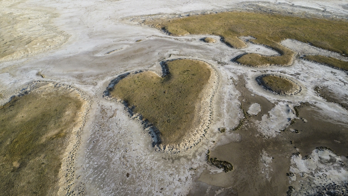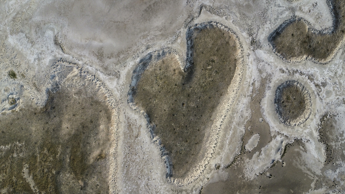 Bazı bölgelerde suların çekildiği göl havzasında oluşan kalp şeklinde ada, dron ile görüntülendi.