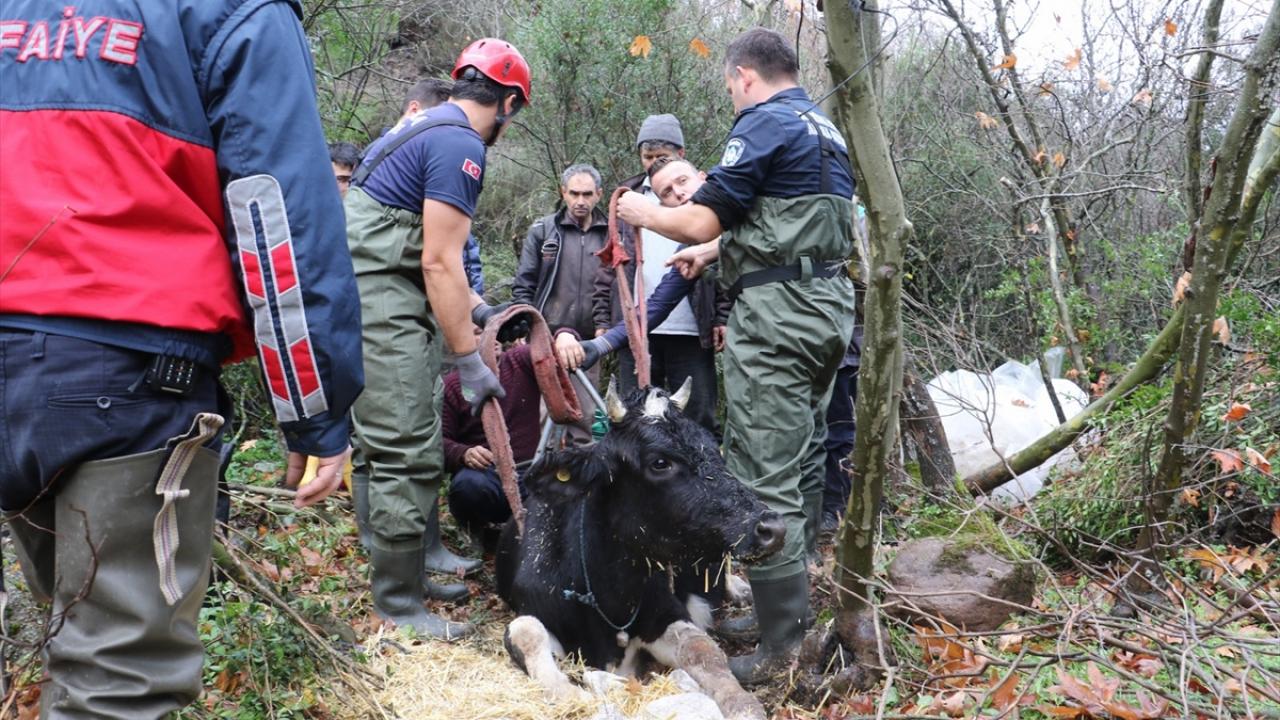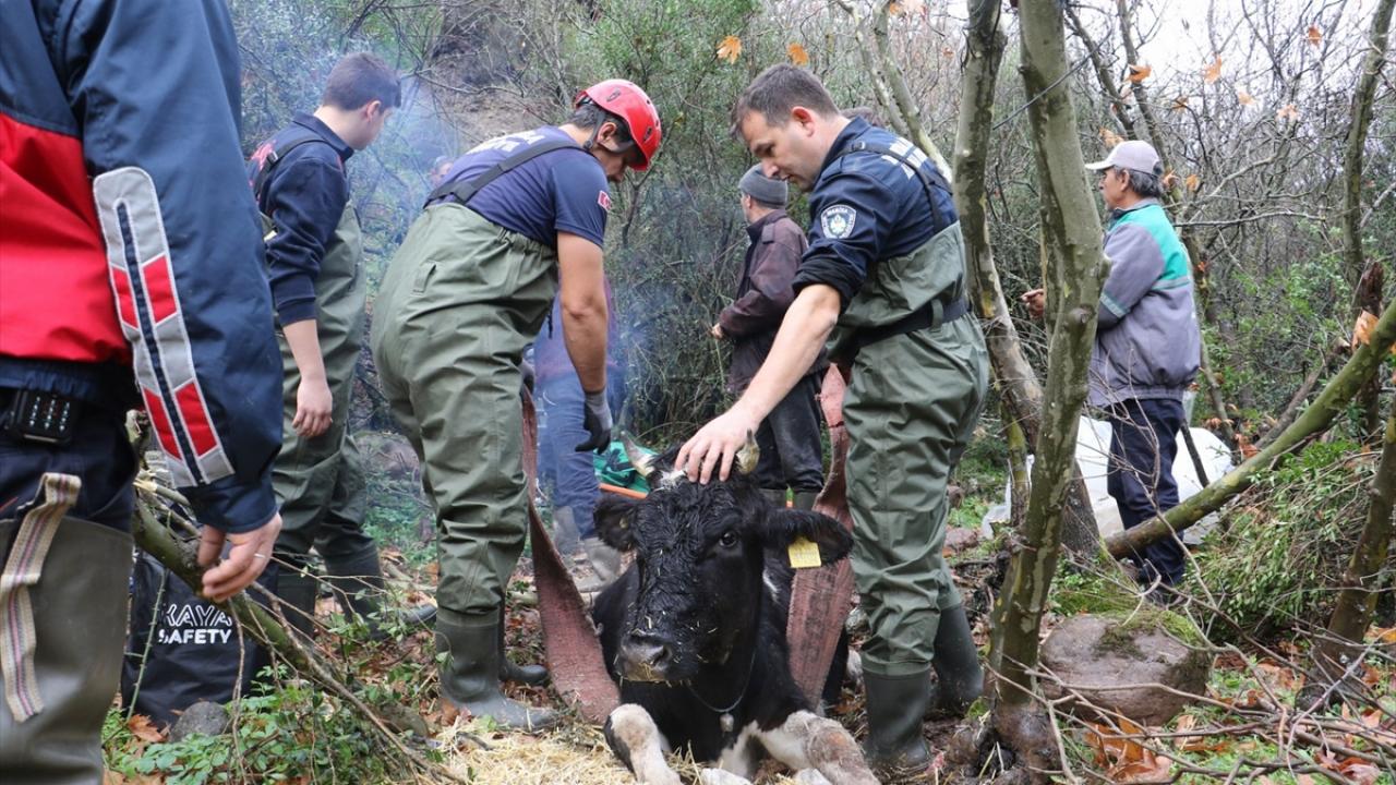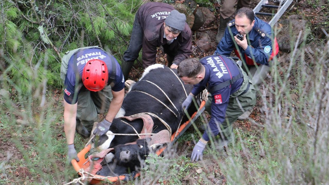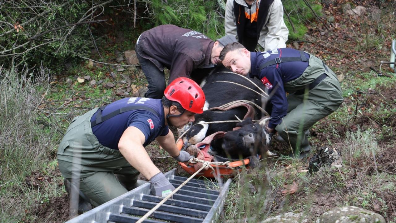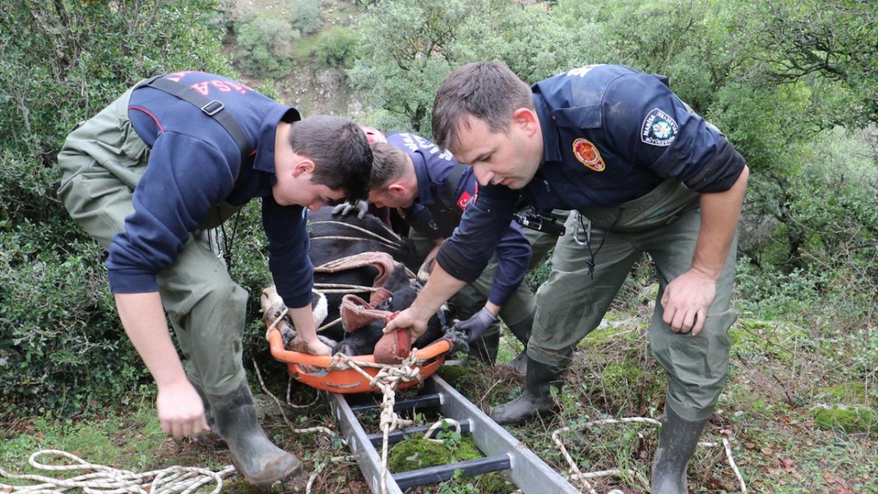 Sarp bölgeyeulaşan 6 kişilik itfaiye ekibi, 4 saatlik zorlu uğraşın ardından ineği düştüğü dere yatağı kenarından çıkararak sahibine teslim etti.