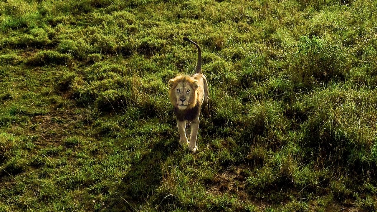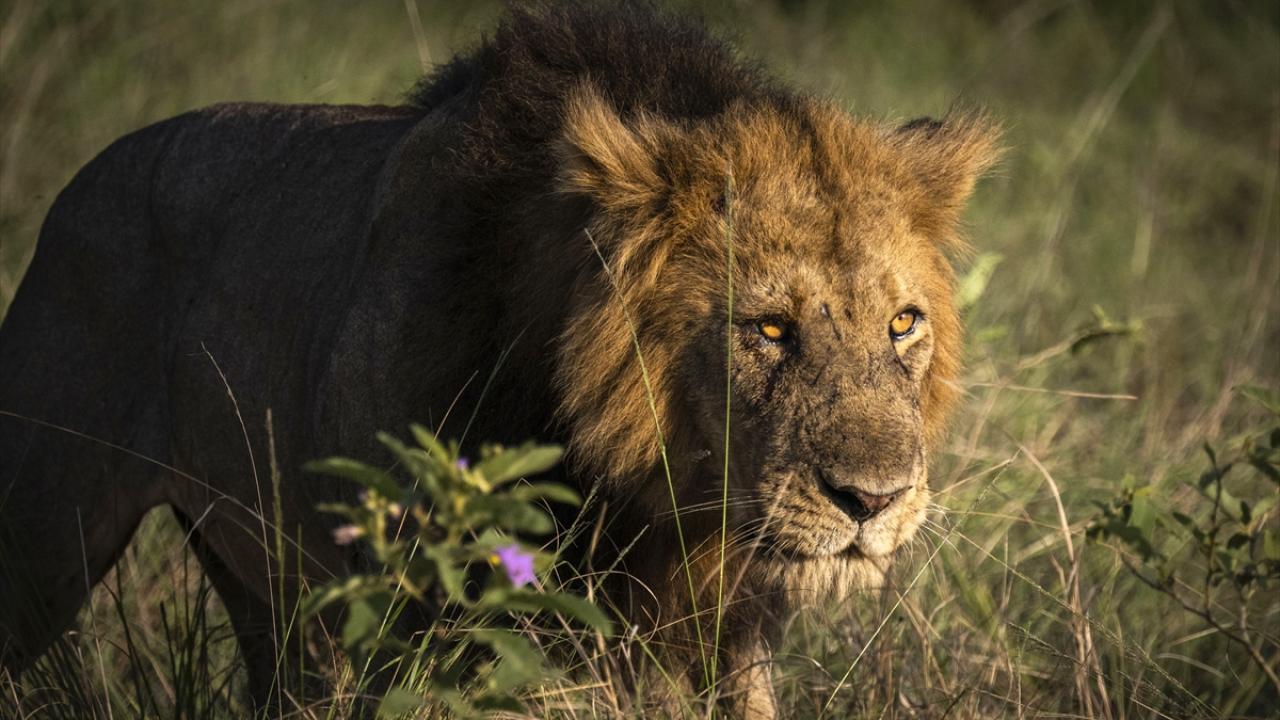 Turistlerin safari turundan karelerin de bulunduğu görüntülerde, "ormanın kralı" olarak adlandırılan aslanın sarı otlar arasında gezindiği anlar da yer aldı.
