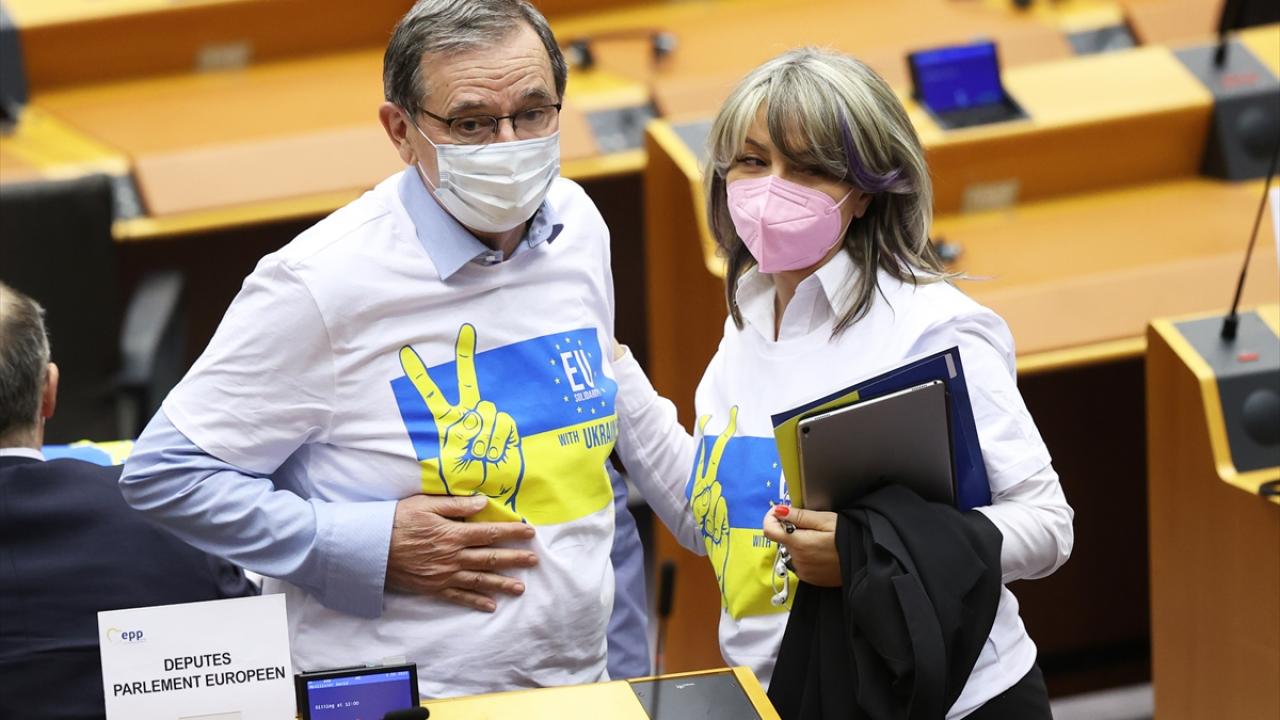 Milletvekillerinin bazıları Ukrayna bayrağını simgeleyen mavi ve sarı renkli kıyafetler giydi ve "Ukrayna`nın yanındayız" yazılı dövizler taşıdı.