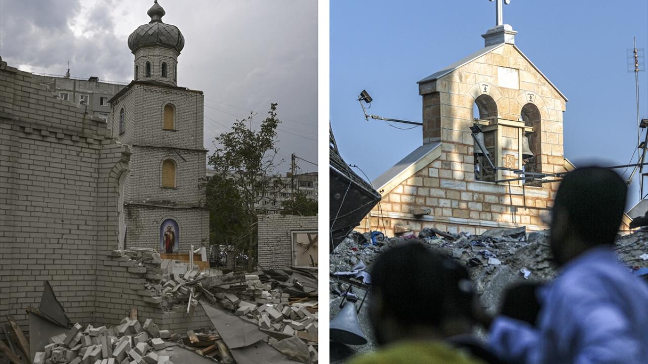 İnsanların gönlünde kutsal yere sahip olan ibadethaneler, Gazze`de ve Ukrayna`daki savaşta hasar görüyor. Rusya`nın Zaporijya kentindeki Şevçenko Mahallesi`ne düzenlendiği saldırı sonucunda harabeye dönüşen kilise ile Gazzeli siviller için sığınak görevi gören ve hasar alan Rum Ortodoks Aziz Porphyrius Kilisesi`nin benzer durumları AA tarafından fotoğraflandı.