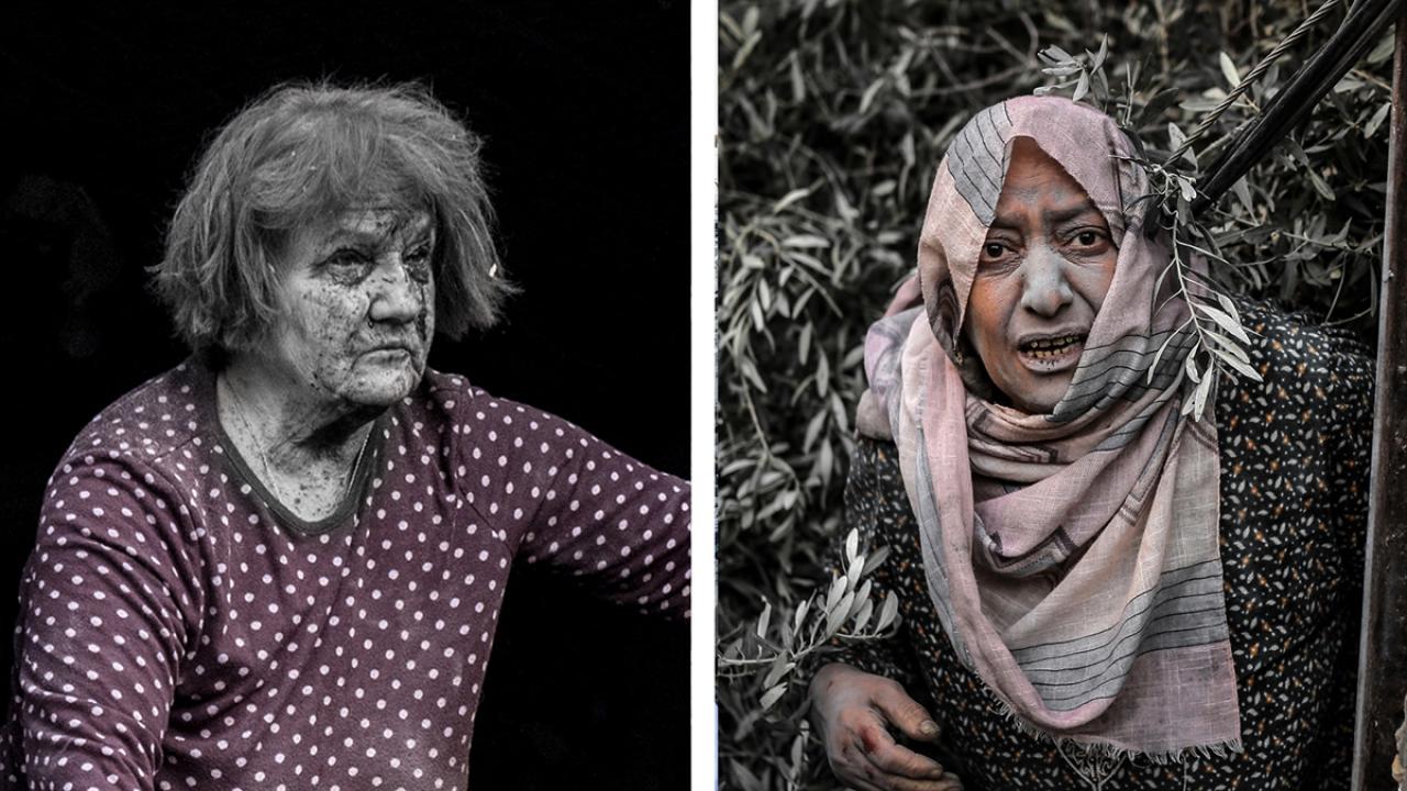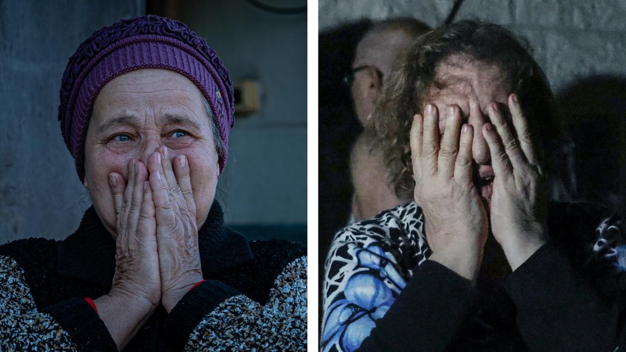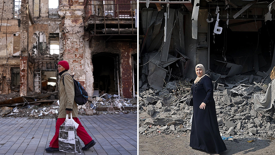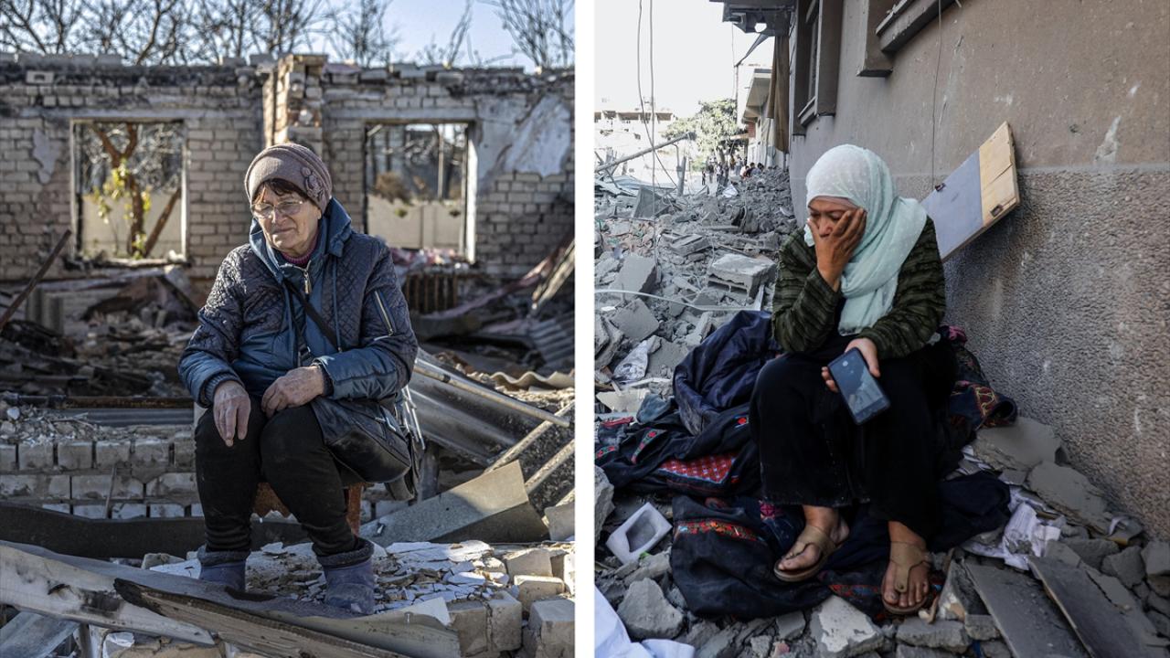 Ukrayna`nın Posad-Pokrovske köyünde, kullanılamaz hale gelen evinin önünde oturan yaşlı kadın ile Gazze`nin Refah kentinde yıkılan evlerin önünde duran kadının fotoğrafları, yaşanan vahşeti hafızalara kazıyor.