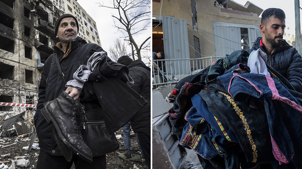 Ukrayna`da ve Gazze`de enkaz altında kalan eşyalarını kurtarmaya çalışan sivillerin benzer durumlarda olduğu, AA`nın karelerine bakıldığında net şekilde görülüyor.