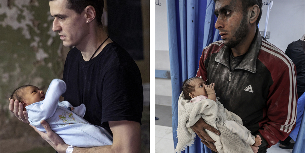 Ukrayna`nın Kiev kentinde Rusya`nın saldırıları sırasında doğum hastanesinin bodrum katında kucakta tutulan bebek ile Gazze`deki Şifa Hastanesine yaralı halde götürülen bebeğin fotoğrafı, sivillerin durumunu gözler önüne seriyor.