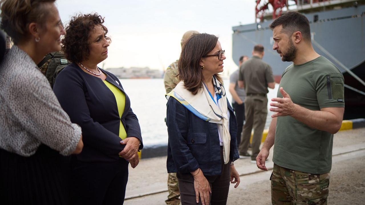 İlk tahıl yüklü geminin ayrılacağı Çornomorsk limanına Zelenskiy ile birlikte ABD’nin Kiev Büyükelçisi Bridget Brink, İngiltere’nin Kiev Büyükelçisi Melinda Simmons, İtalya’nın Kiev Büyükelçisi Pier Francesco Zazo, Kanada’nın Kiev Büyükelçisi Larisa Galadza, Almanya’nın Kiev Büyükelçisi Anka Feldhusen, AB Ukrayna Delegasyonu Başkan Yardımcısı Remi Duflot, BM Ukrayna İnsani Yardım Koordinatörü Osnat Lubrani ve Ukrayna’da akredite diplomatik misyonların temsilcileri de geldi ve tahıl yükleme süreci hakkında bilgi aldı.