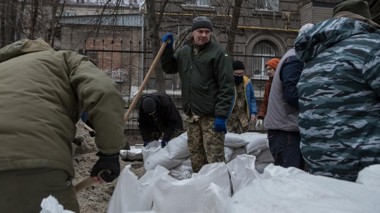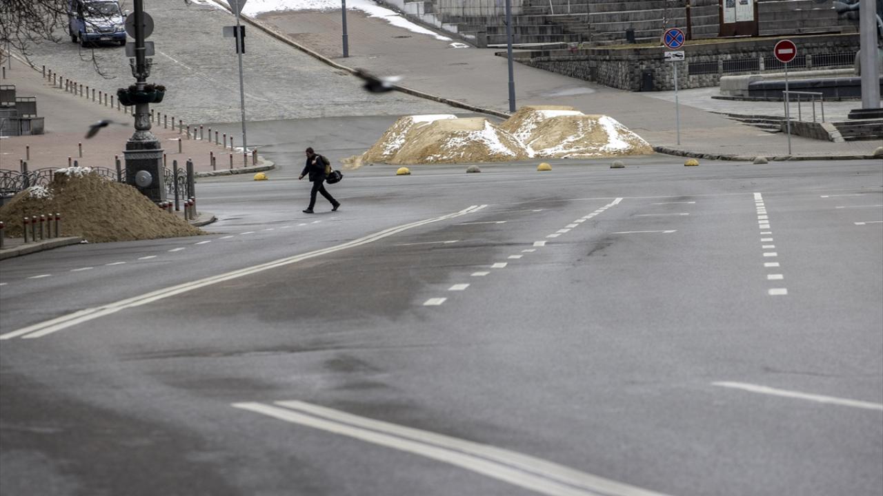 Kiev`de aralıklara siren sesleri duyulmaya devam ediyor. Bazı caddelere kamyonla toprak taşınıp yığınak yapılıyor.