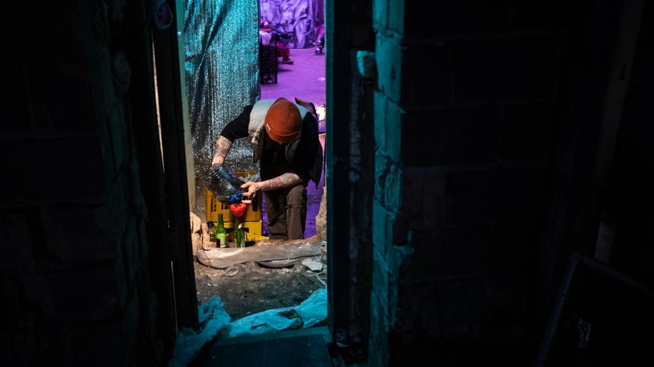 Başkent Kiev’deki bir gece kulübünde kendi imkanlarıyla bir araya gelen siviller molotof kokteyli hazırlıyor.
