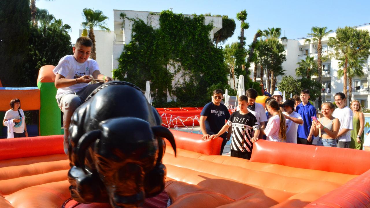 Rodeo boğası, langırt ve gol atma etkinliklerinde sportif yeteneklerini sergileyen çocuklar, kumaş boyama ve kil heykel yapımında ise el becerisini gösterdi.