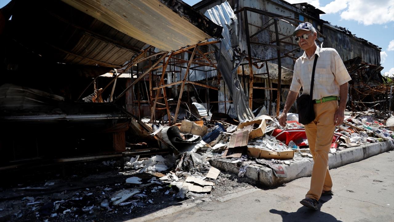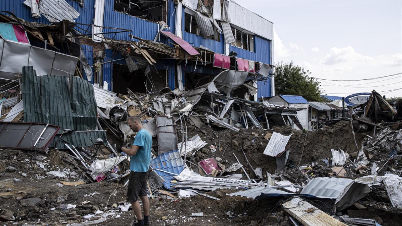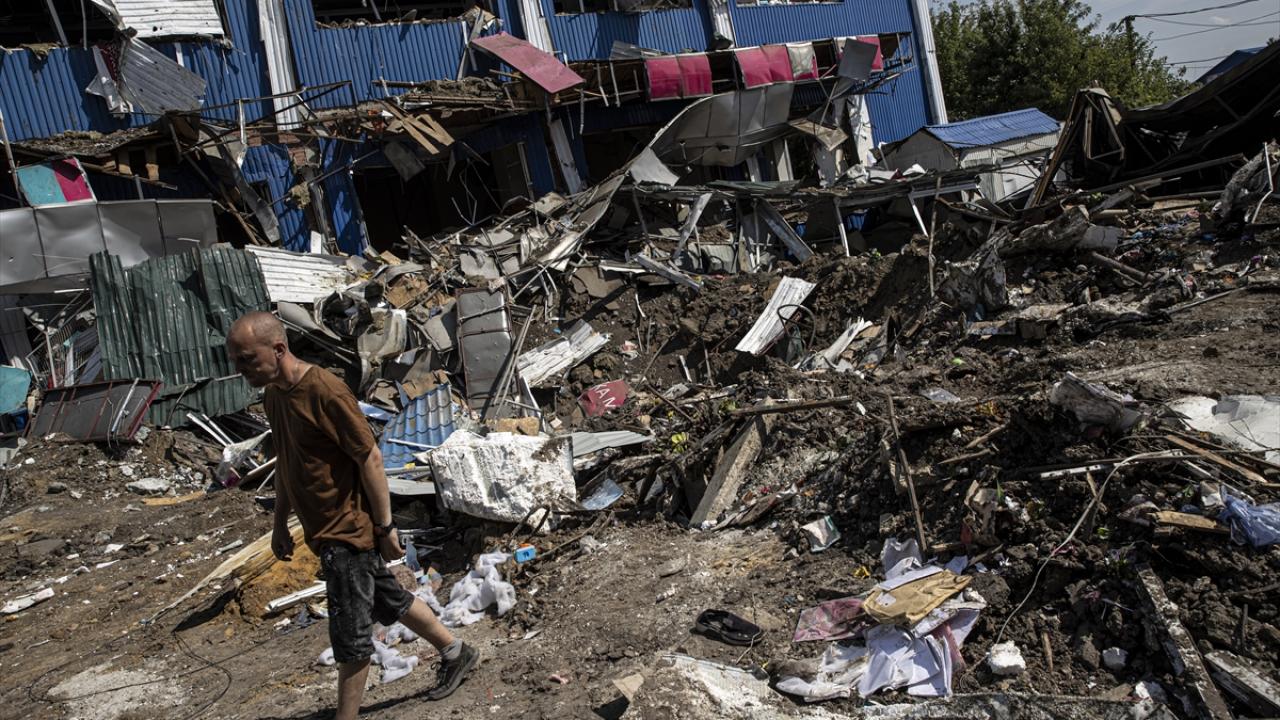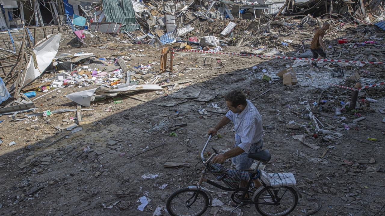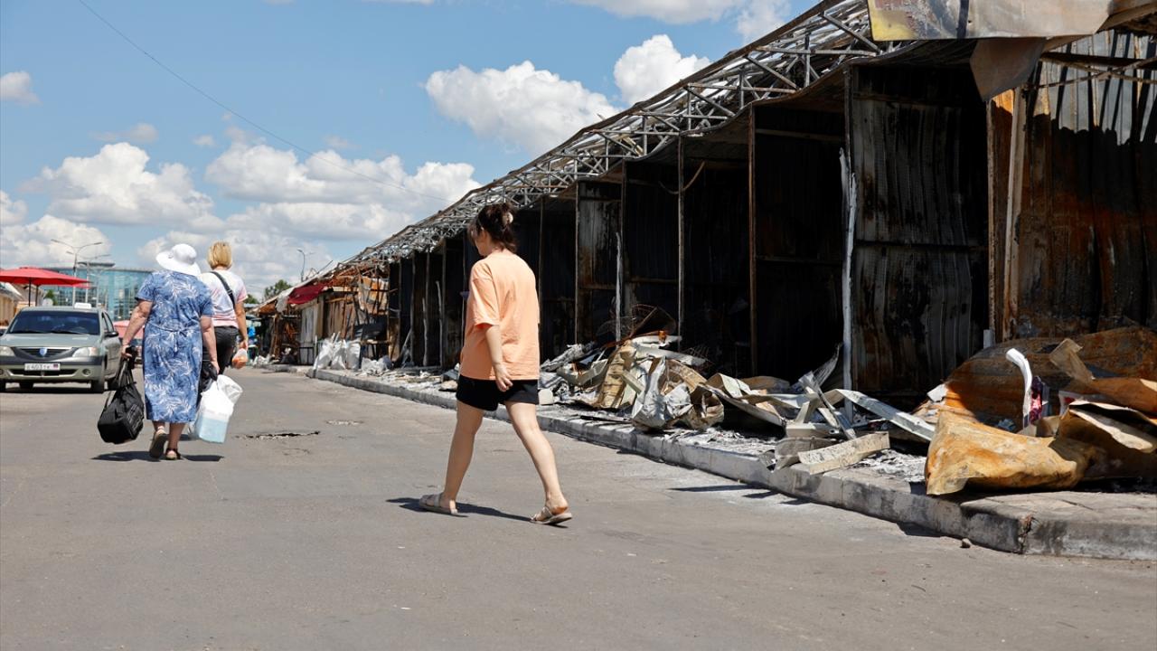 Fotoğrafta, daha önce Rus güçlerince hava saldırısı düzenlenen Bahmut kentindeki pazar yeri görülüyor.