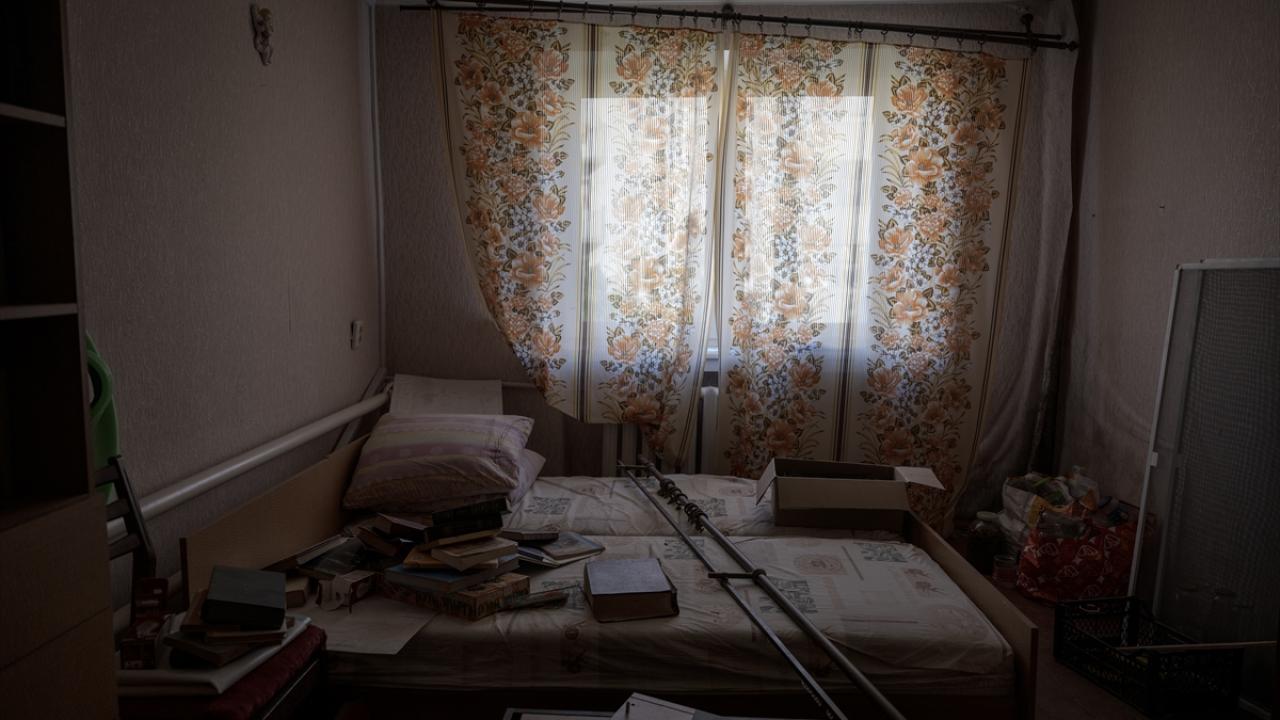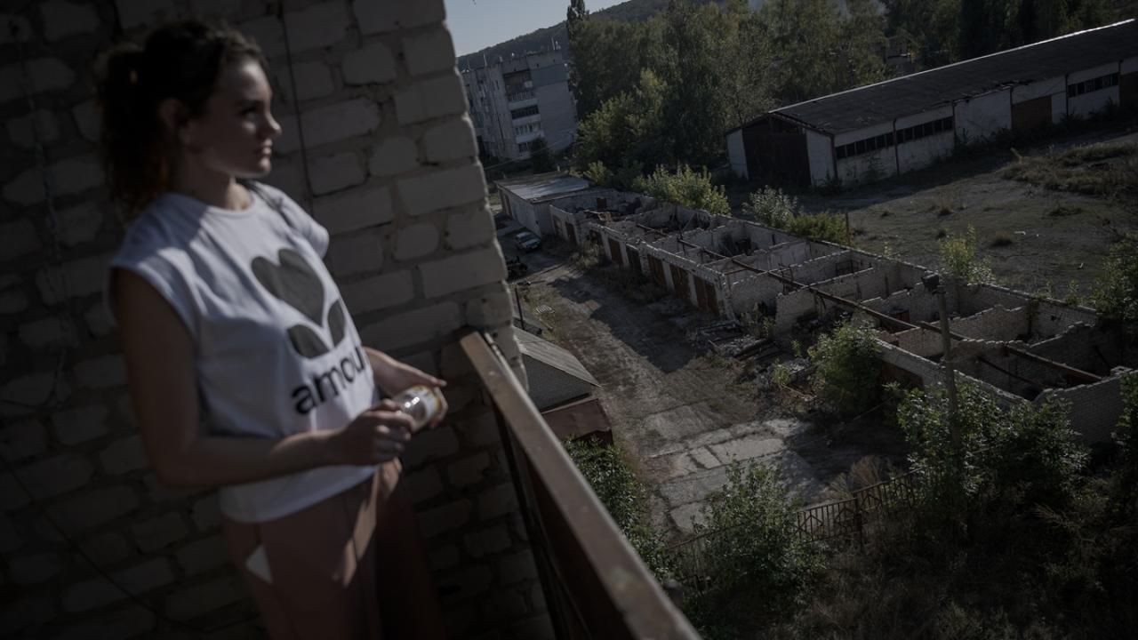 Oturduğu bina bombalandıktan sonra Harkiv merkeze taşınan Alyona, zaman zaman arkadaşlarını görmek için geldiği Staryi Saltiv`de eski evinin balkonundan yıkılan binalara bakıyor.