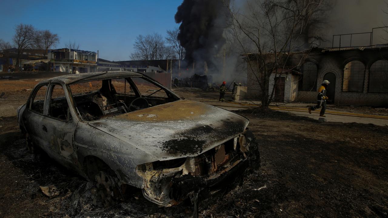 Harkiv`de yanmış bir araç.