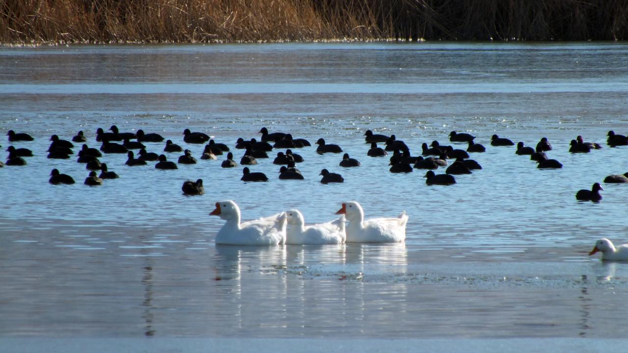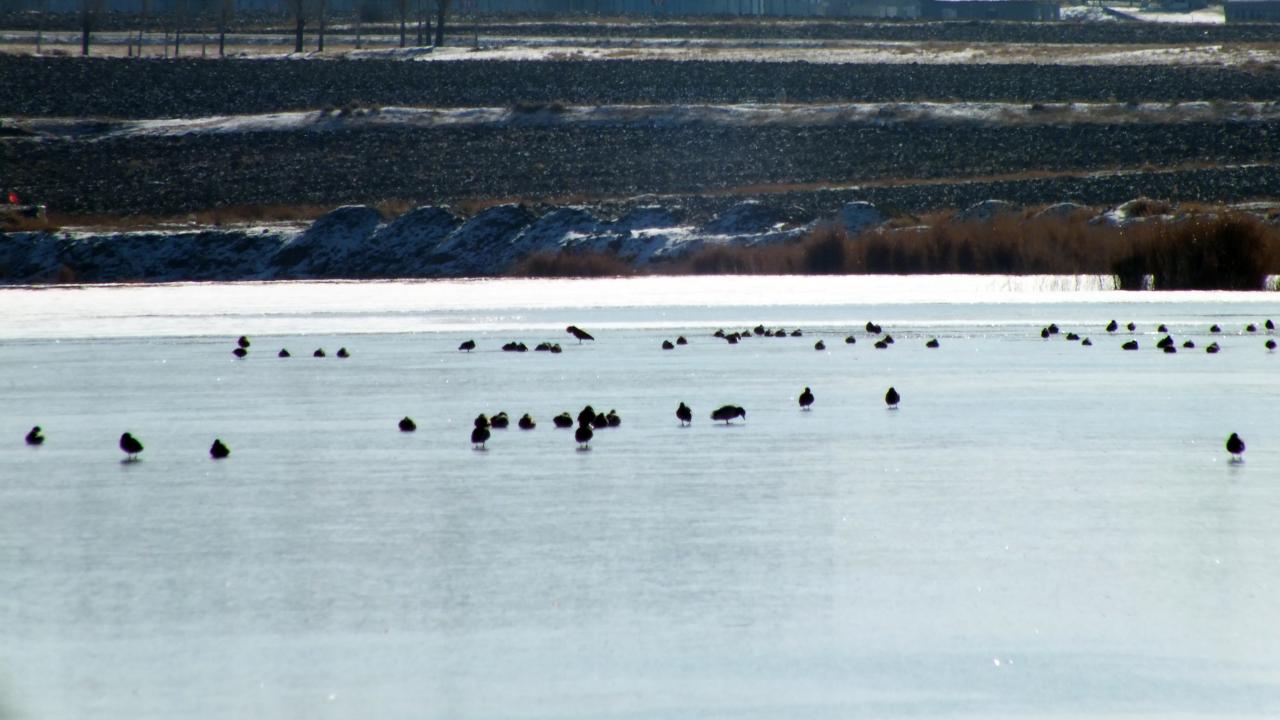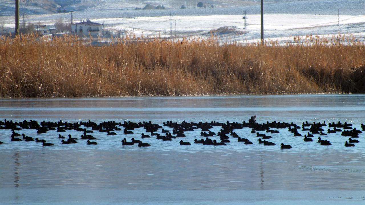 Kış mevsiminin gelmesiyle yiyecek bulmada sıkıntı yaşayan kuşların, bir bölümü buzla kaplı suda toplu halde açık alan bulmaya çalıştıkları gözlemlendi.