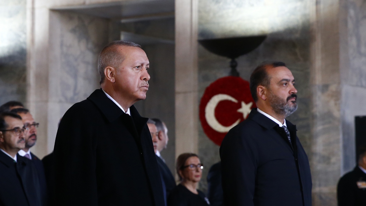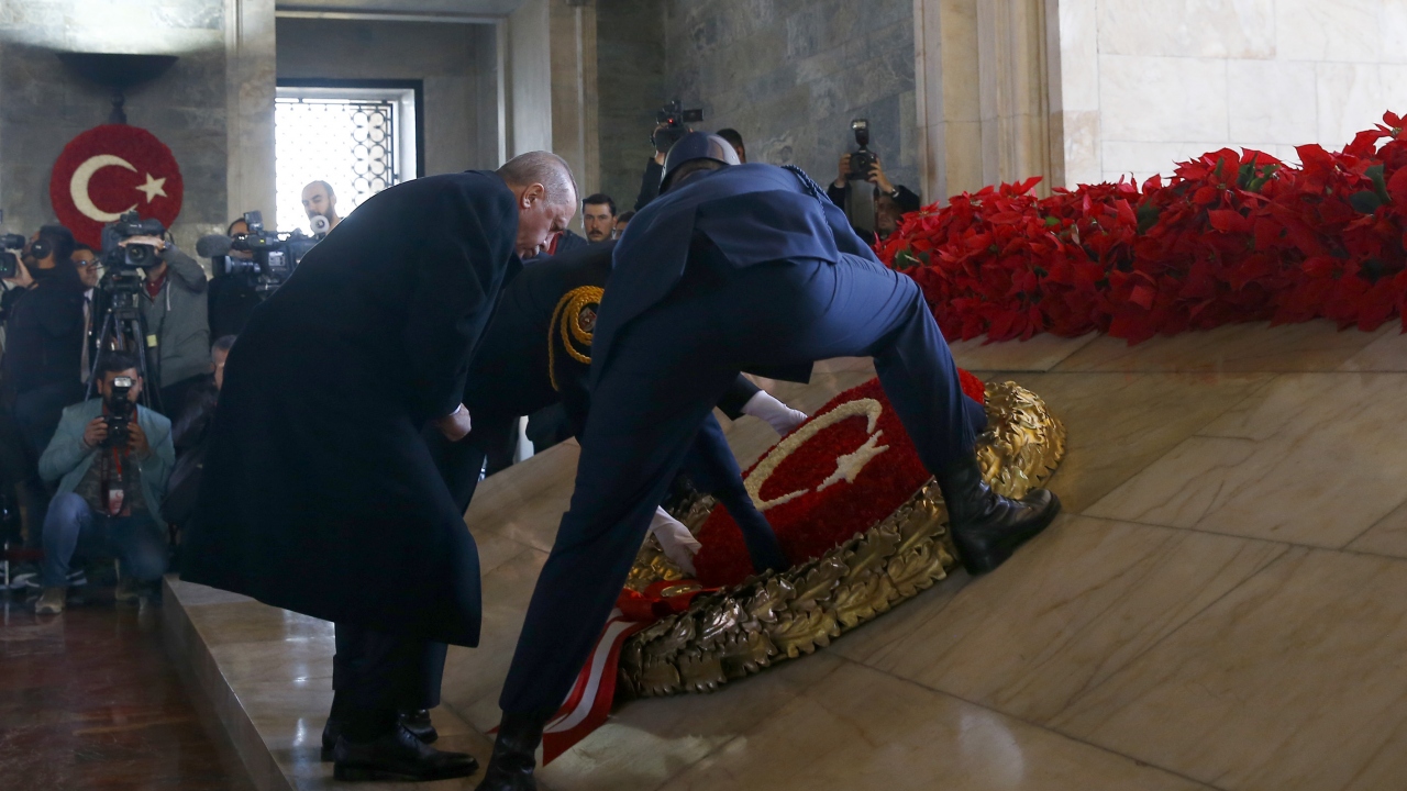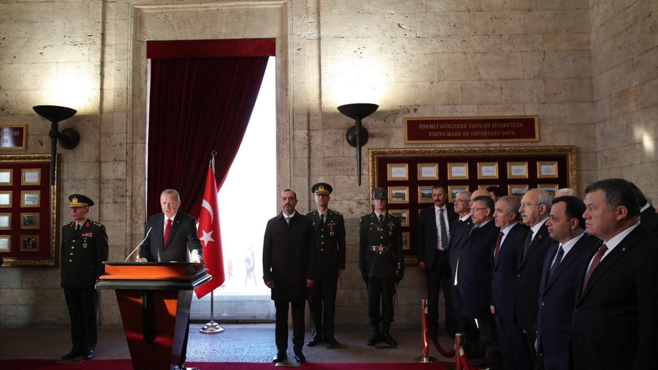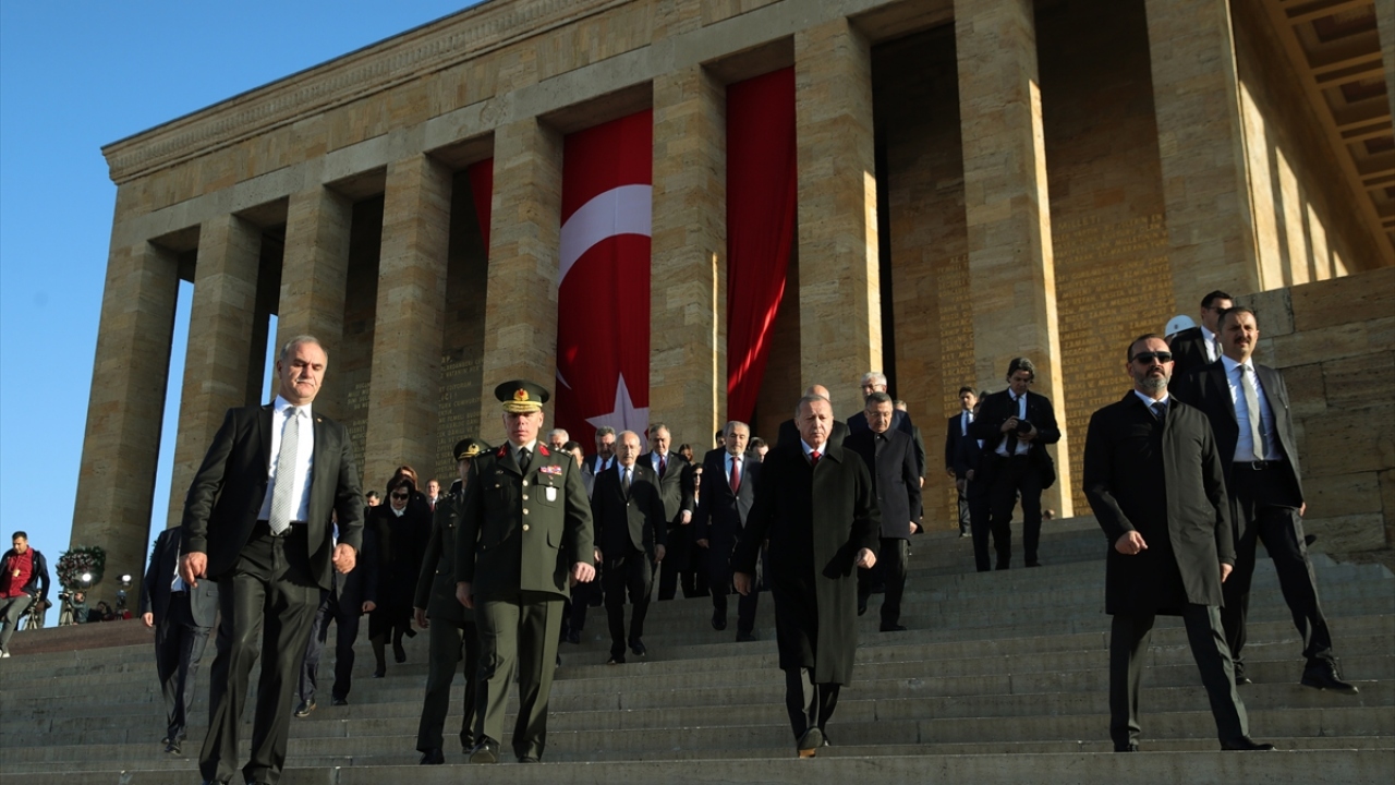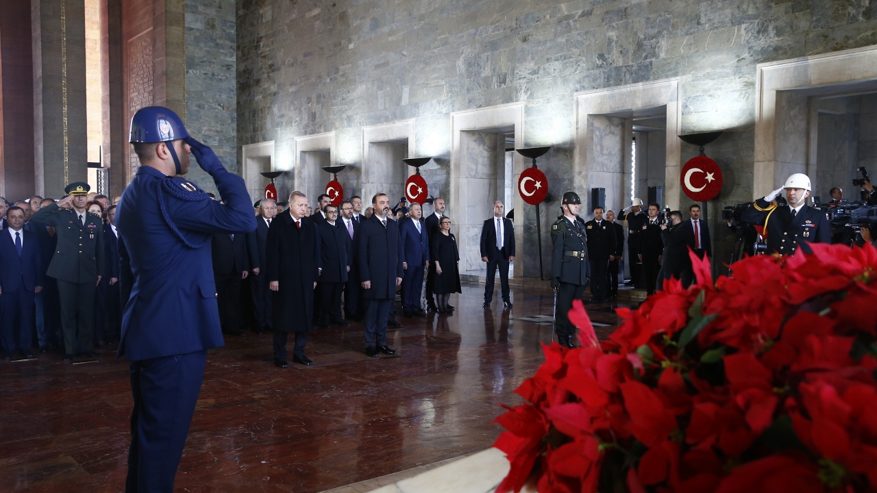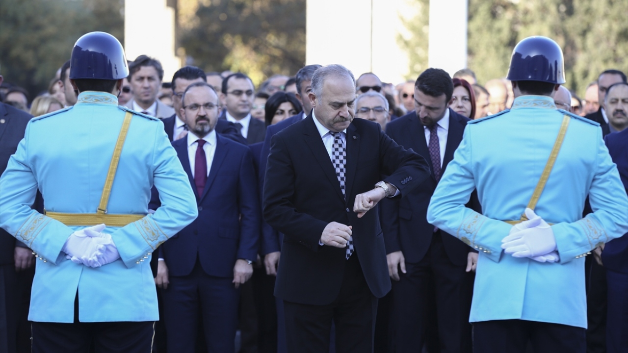 Türkiye Cumhurbaşkanı Recep Tayyip Erdoğan başkanlığındaki heyet, Atatürk`ün vefat ettiği saat olan 09.05`te mozole önünde saygı duruşunda bulundu.