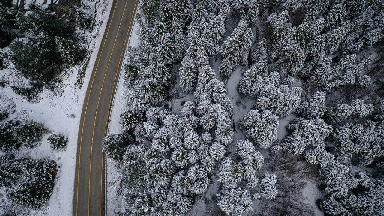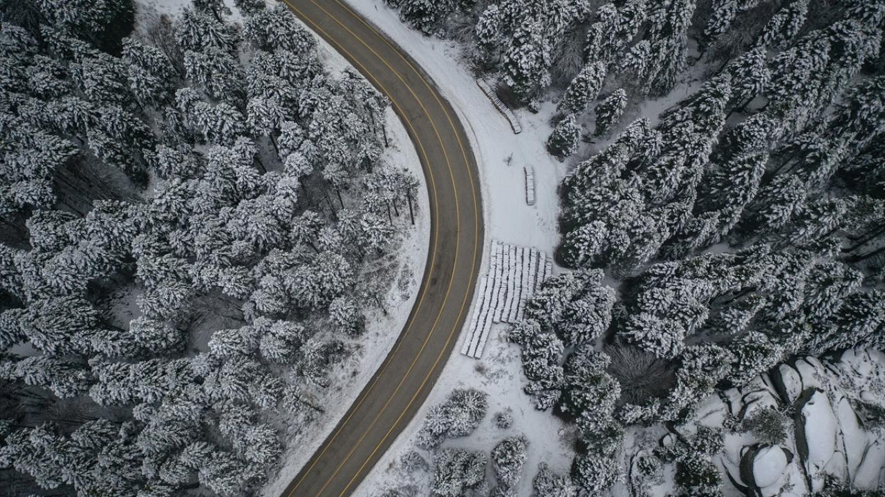 Uludağ'da etkili olan kar yağışı sonrası virajlı yollar, eşsiz manzaralar oluşturdu. Kar yağışının ardından beyaz örtü ve kıvrımlı yollar, havadan görüntülendi.