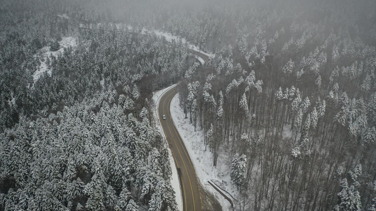 Uludağ`da kar yağışının ardından beyaz örtüsü ve kıvrımlı yolları dronla da havadan görüntülendi.