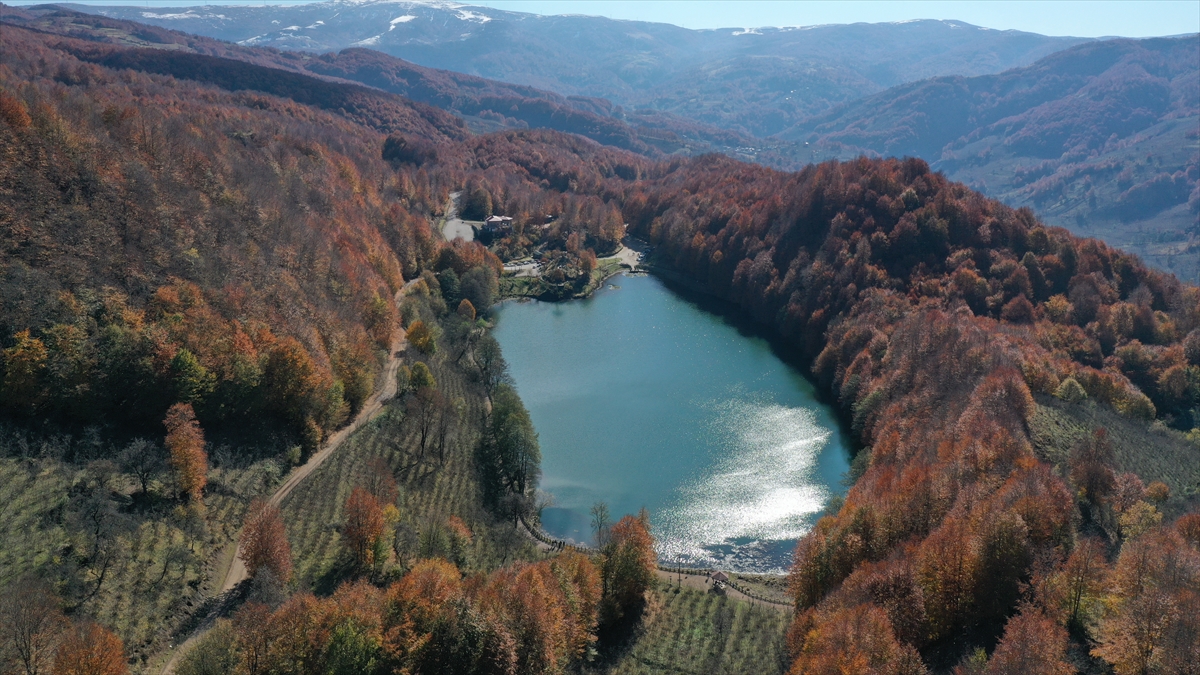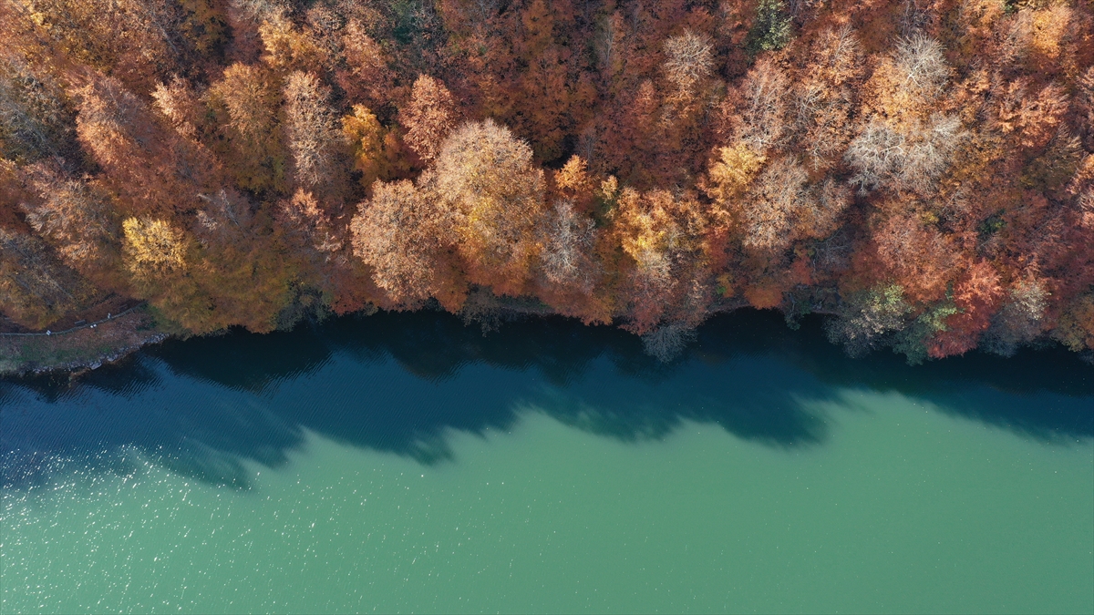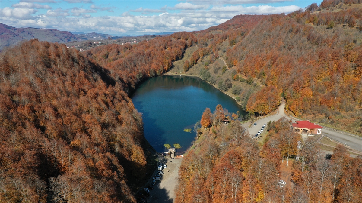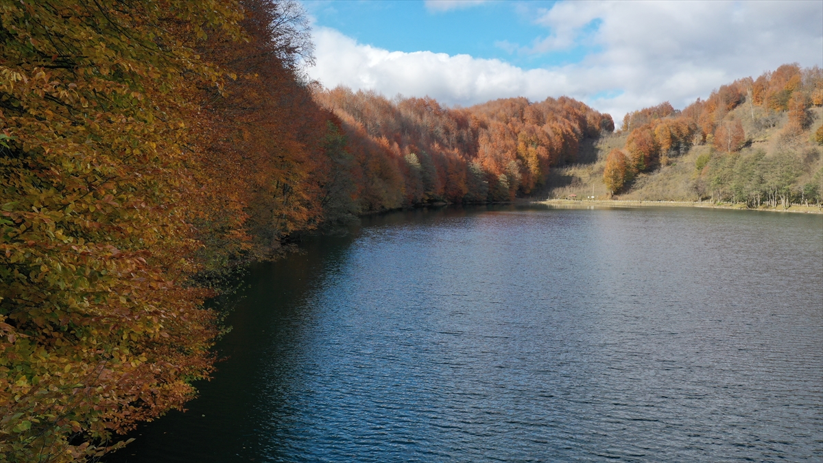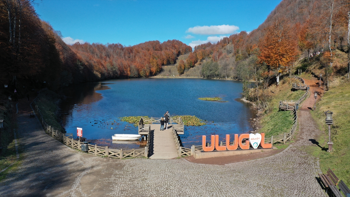 Türkiye`nin 36. tabiat parkı olma özelliğini taşıyan Ulugöl`e gelen ziyaretçiler, sarı, yeşil ve kırmızı tonlarındaki ağaçların arasında yürüyerek vakit geçiriyor.