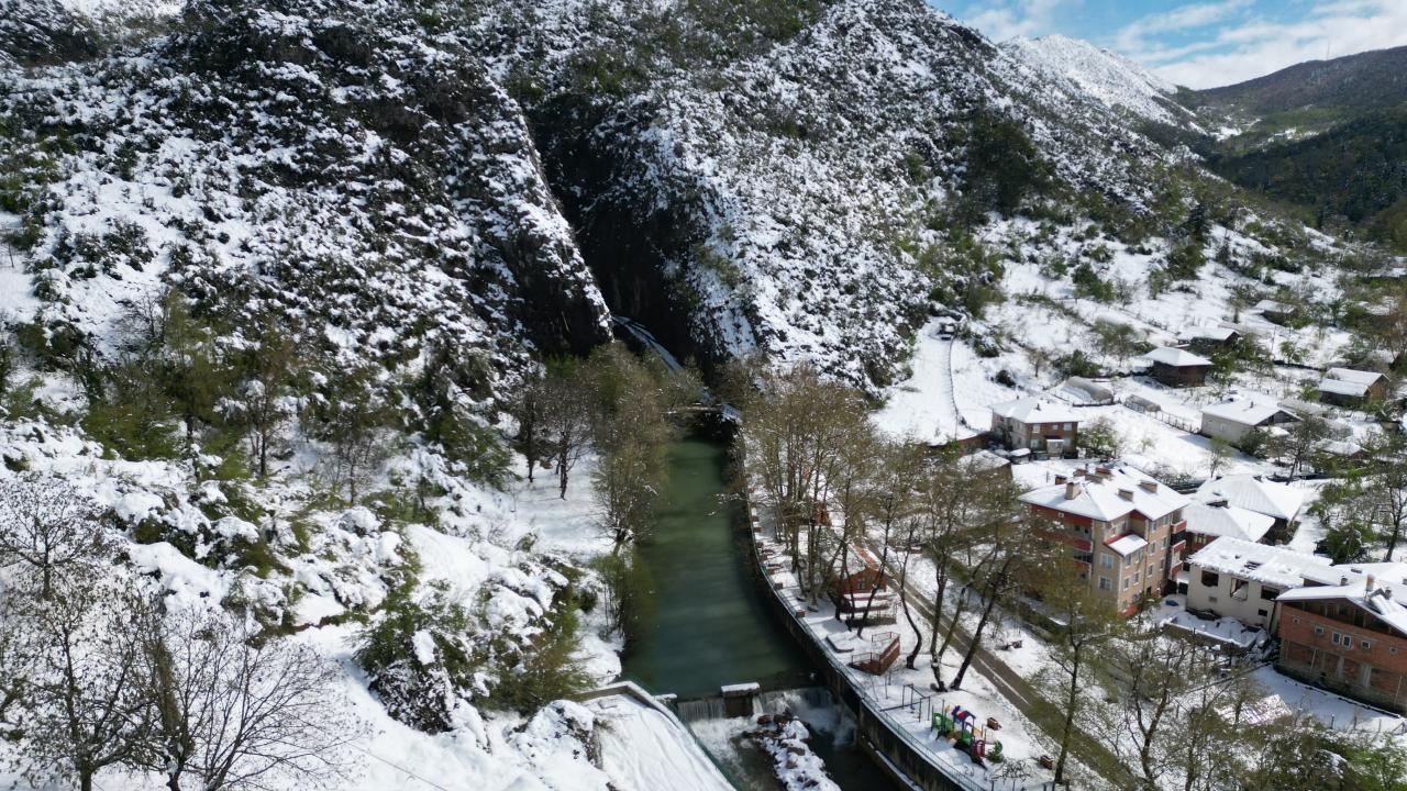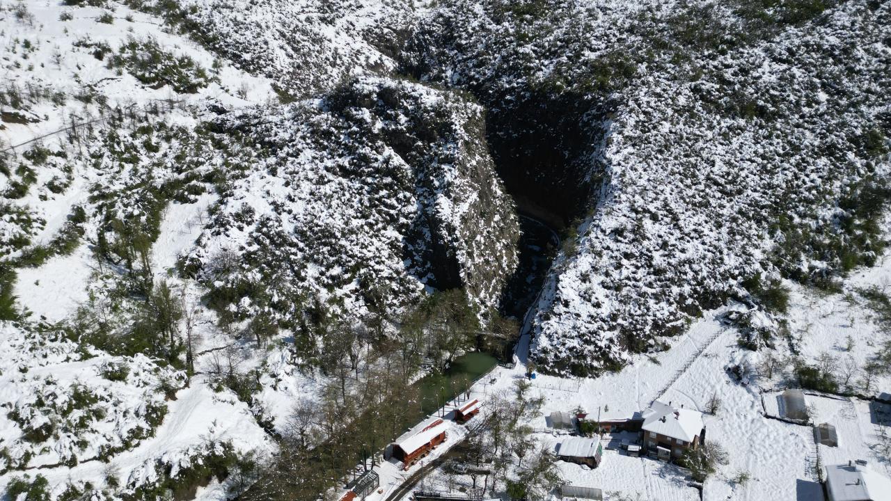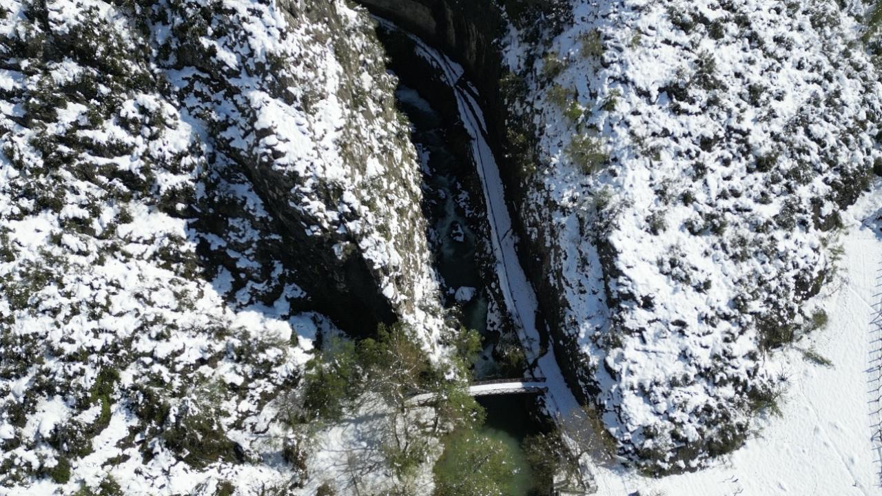 Bartın'ın Ulus ilçesinde 'aşk acısını dindiren şelale' olarak ünlenen Ulukaya Kanyonu ve Şelalesi, nisan ayında karla kaplandı. Bölgedeki eşsiz manzara havadan dron ile görüntülendi.