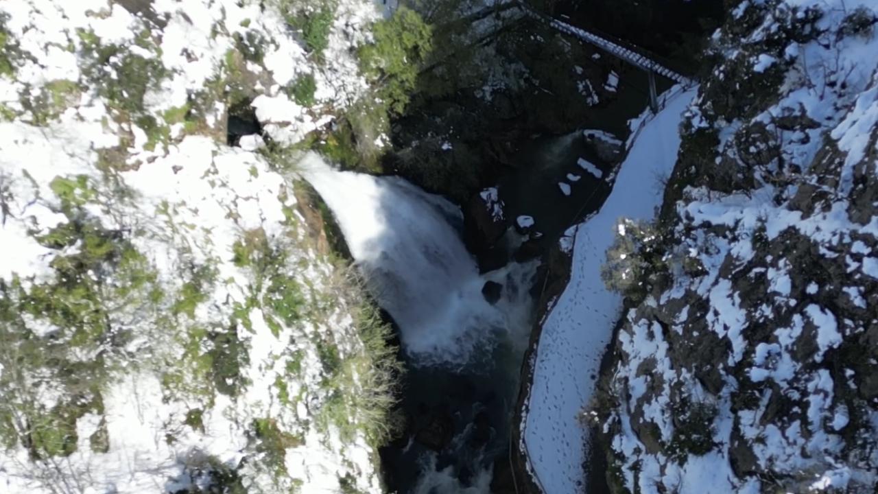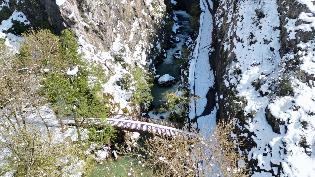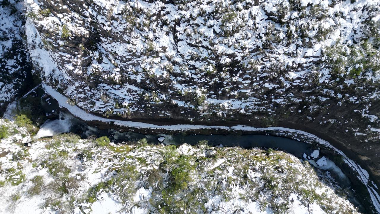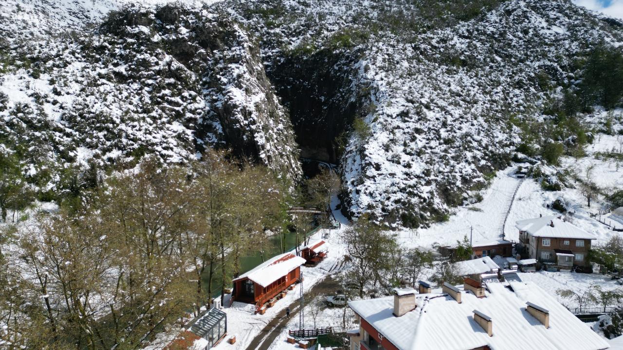Bartın'ın Ulus ilçesinde 'aşk acısını dindiren şelale' olarak ünlenen Ulukaya Kanyonu ve Şelalesi, nisan ayında karla kaplandı. Bölgedeki eşsiz manzara havadan dron ile görüntülendi.