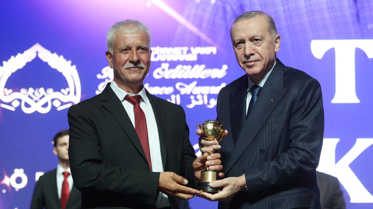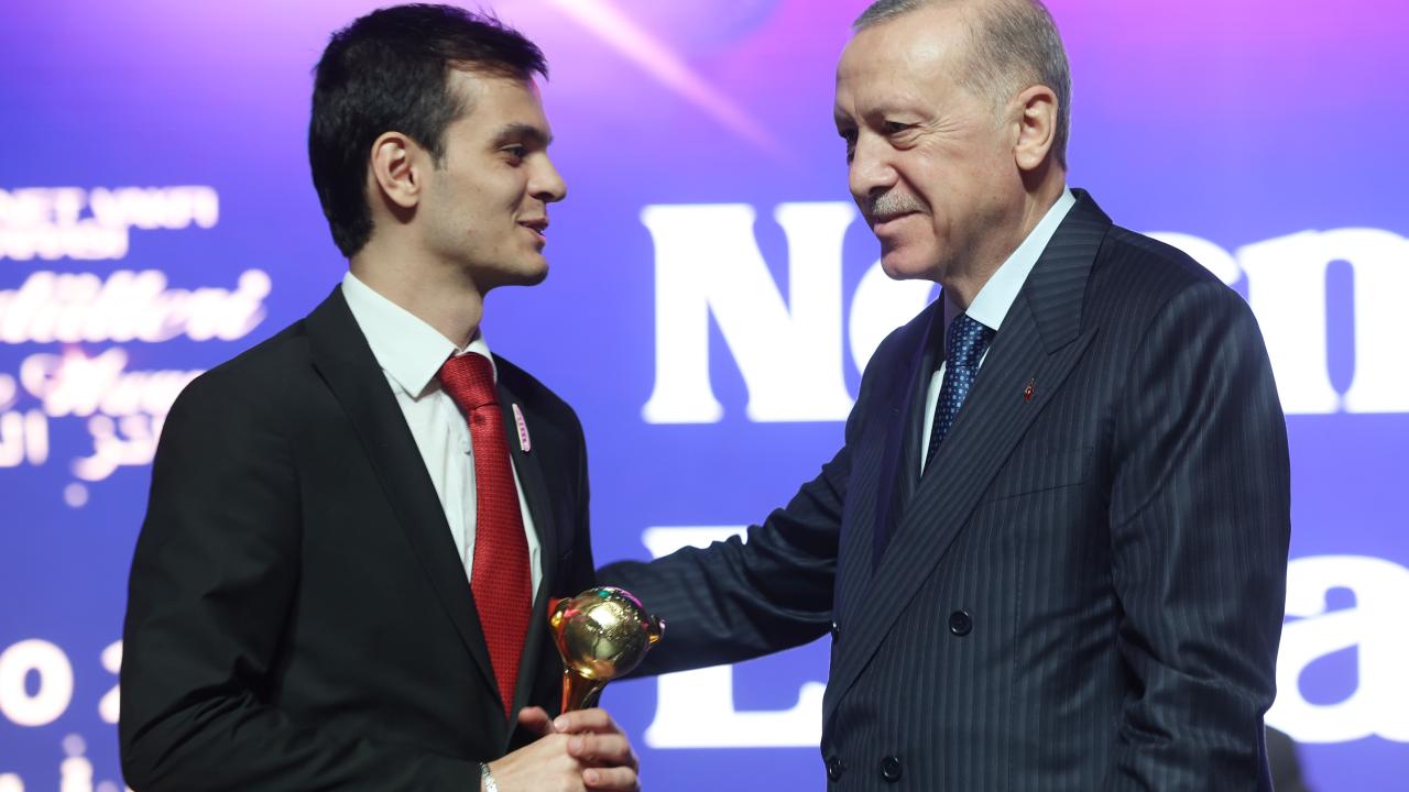 Cumhurbaşkanı Erdoğan, yurt içi iyilik ödülüne layık görülen İstanbul`da Aralık 2023`te düzenlenen Avrupa Wushu Kungfu Şampiyonası`nda şampiyon olduktan sonra podyumda Filistin bayrağı açarak dabke dansı yaptığı için şampiyonluğu iptal edilen Türk wushu kungfu sporcusu Necmettin Erbakan Akyüz`e ödülünü verdi.