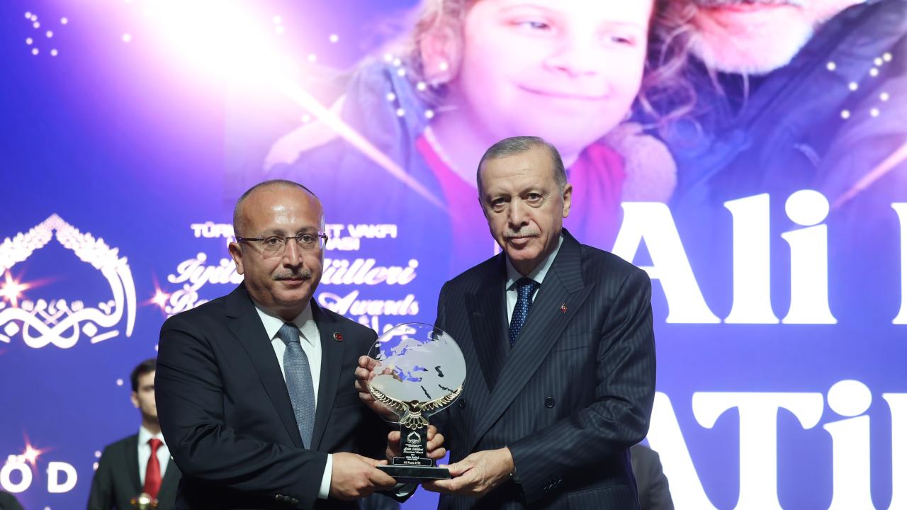 Cumhurbaşkanı Erdoğan, yurt içi iyilik ödülüne layık görülen Kayseri`nin İncesu ilçesinde 1410 cami için 25 yıl boyunca yetecek elektrik enerjisini üreten güneş panellerini kuran Ahmet Seferoğlu`na ödülünü verdi.