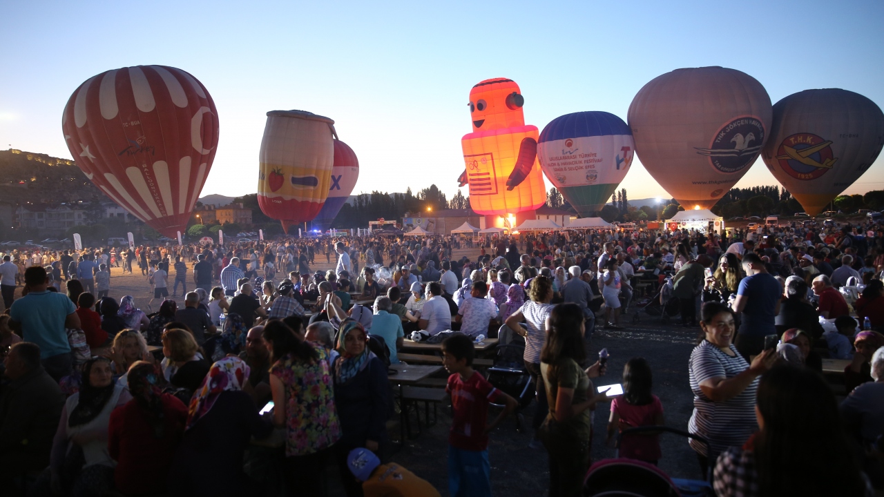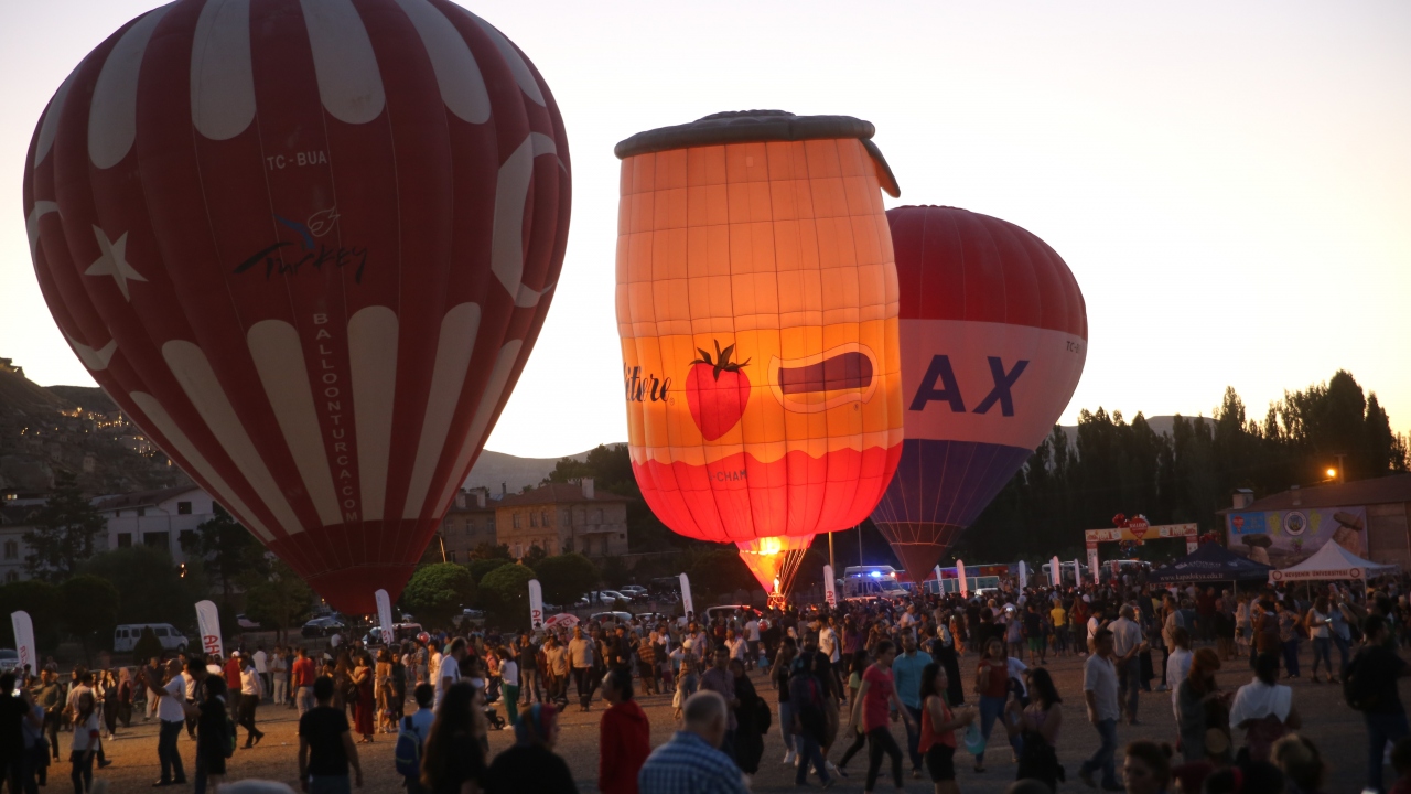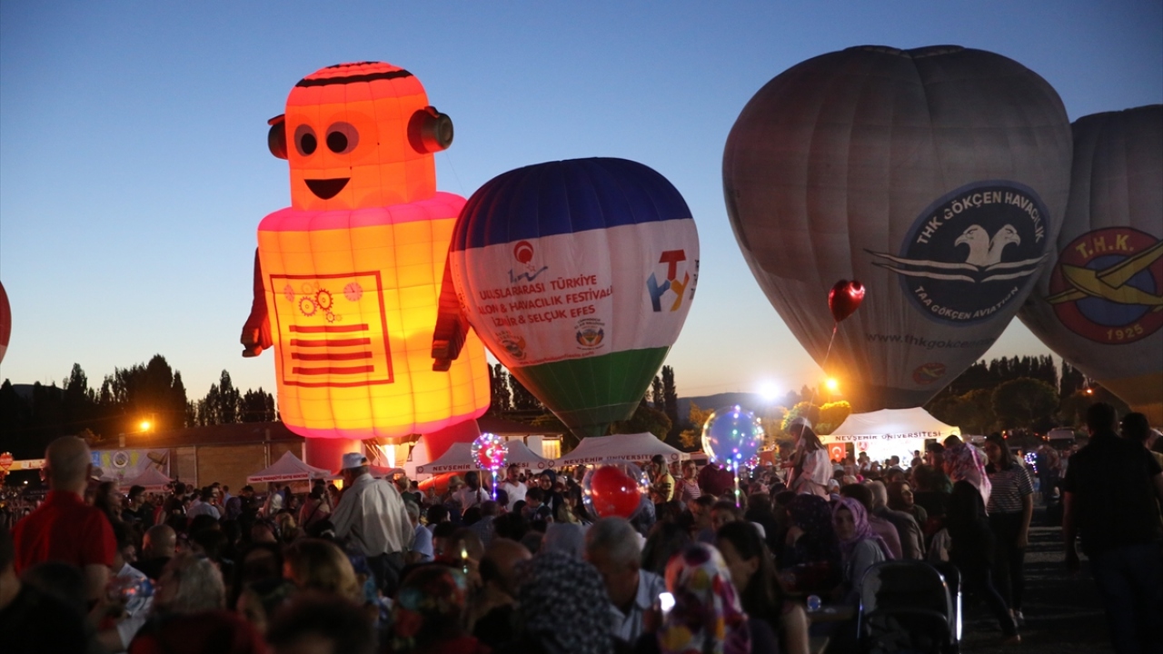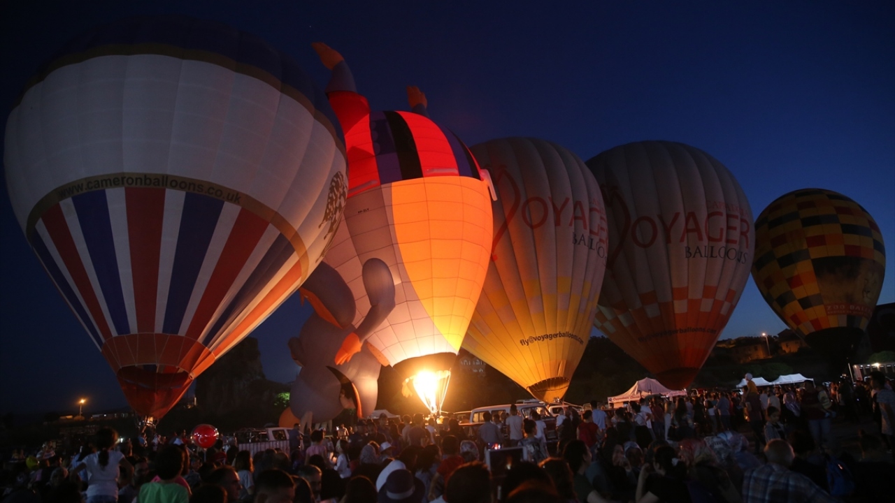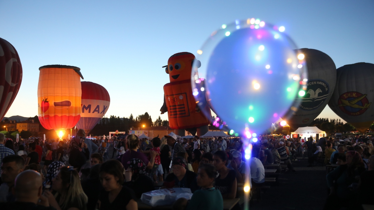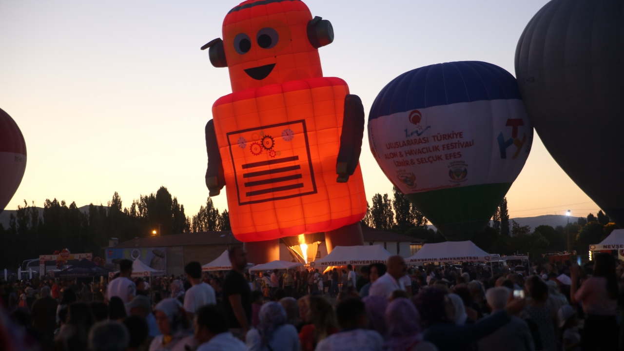 Kapadokya`yı ziyaret eden turistlere için hazırlanan turlarda kullanılan sıcak hava balonları ve festival için yurt dışından getirilen figürlü balonlar müzik eşliğinde ışık gösterisi yaptı.