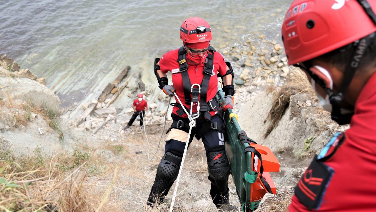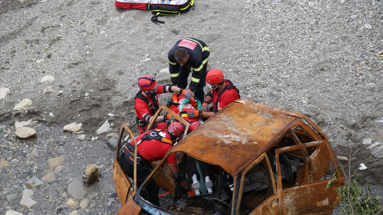 Tatbikatta senaryo gereği 112 Acil Çağrı Merkezi`ne kayalıklardan düşen bir otomobilde mahsur kalan kişi bilgisi ulaştı.