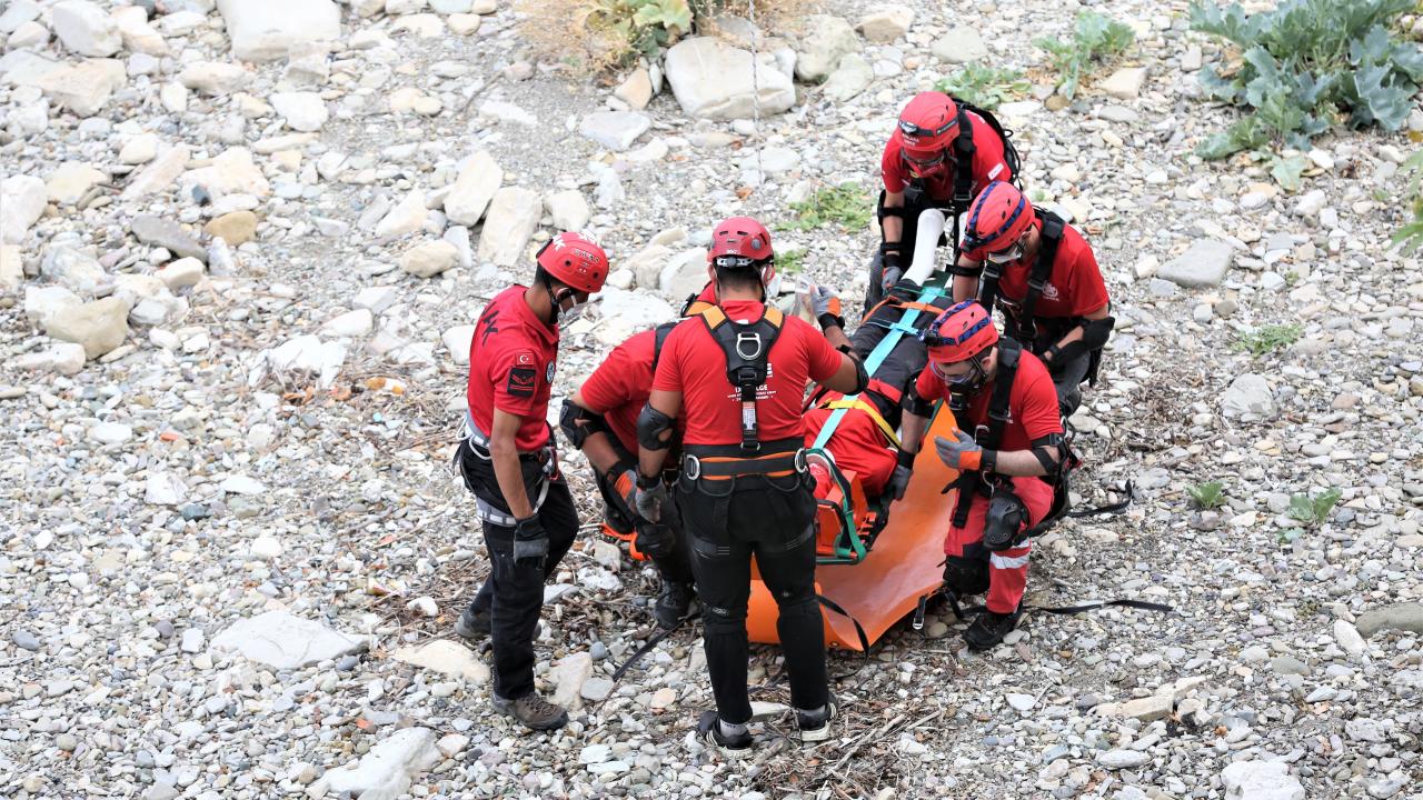 Helikopterden halat yardımıyla uzatılan sedyeye konulan yaralı, yine halat yardımıyla helikoptere alındı.