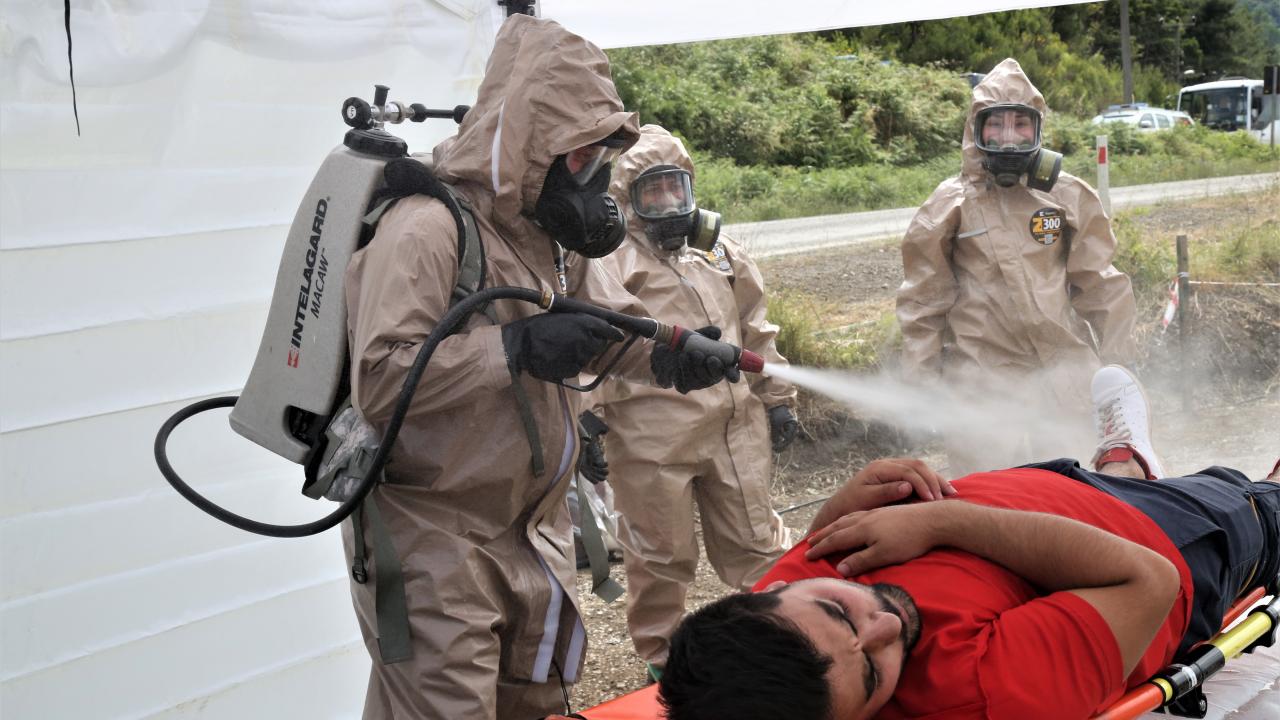 Kimyasal, biyolojik, radyoaktif ve nükleer (KBRN) şüpheli tankın yanında mahsur kalan kişiye de özel kıyafetli UMKE personelince müdahale edildi.