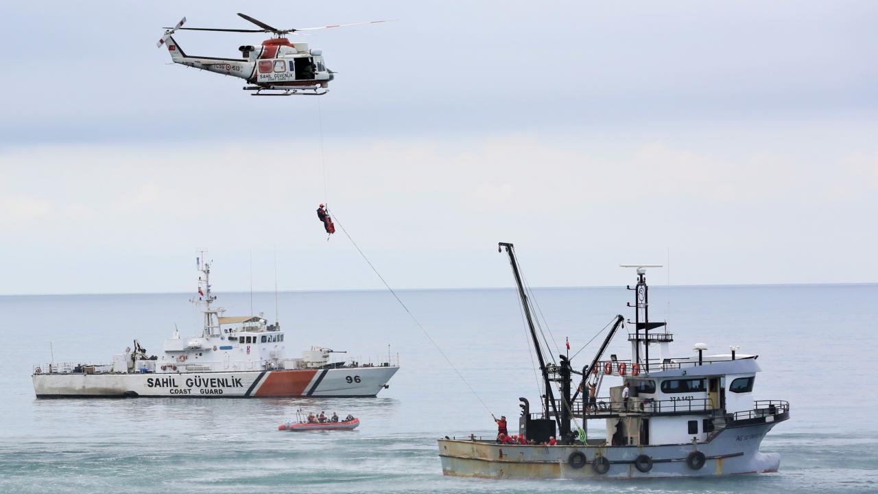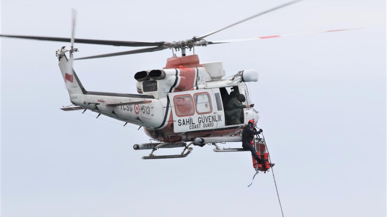 Tatbikatta, su ürünleri teknesinde meydana gelen iş kazası sonucu bir kişinin bacağının koptuğu bilgisi gelen ekipler, yaralının kurtarılması için Sahil Güvenlik Komutanlığı’na ait helikopterden yardım istedi.