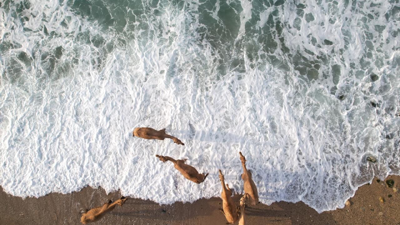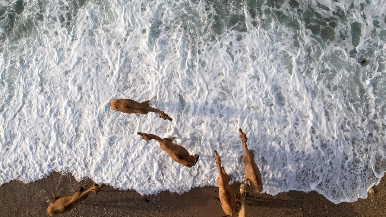 Zorlu yolculuğun sonunda denize ulaşan develer, suya girerek serinliyor.