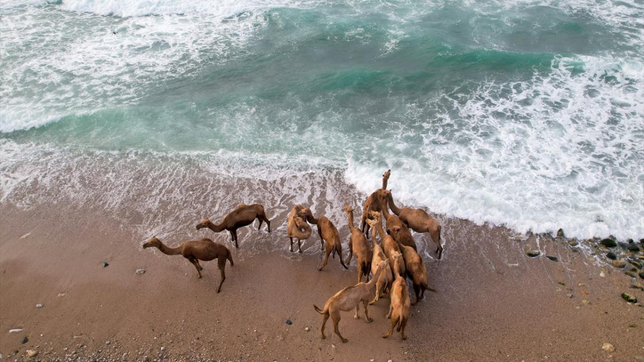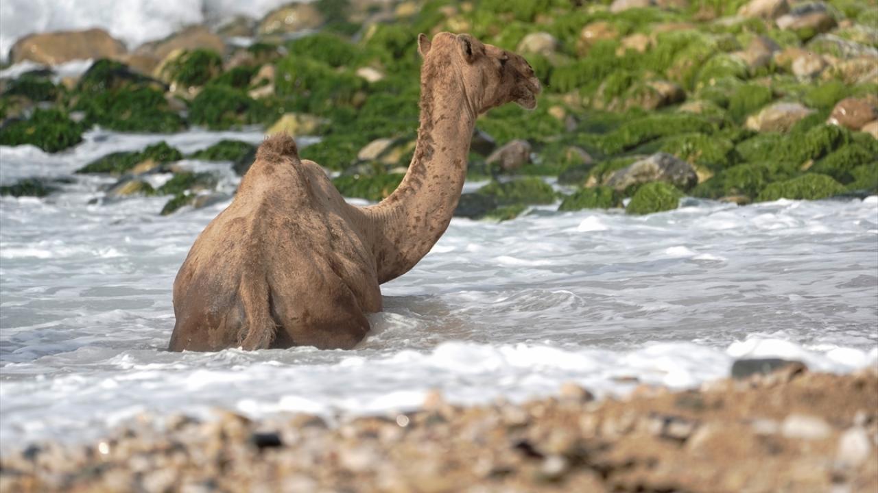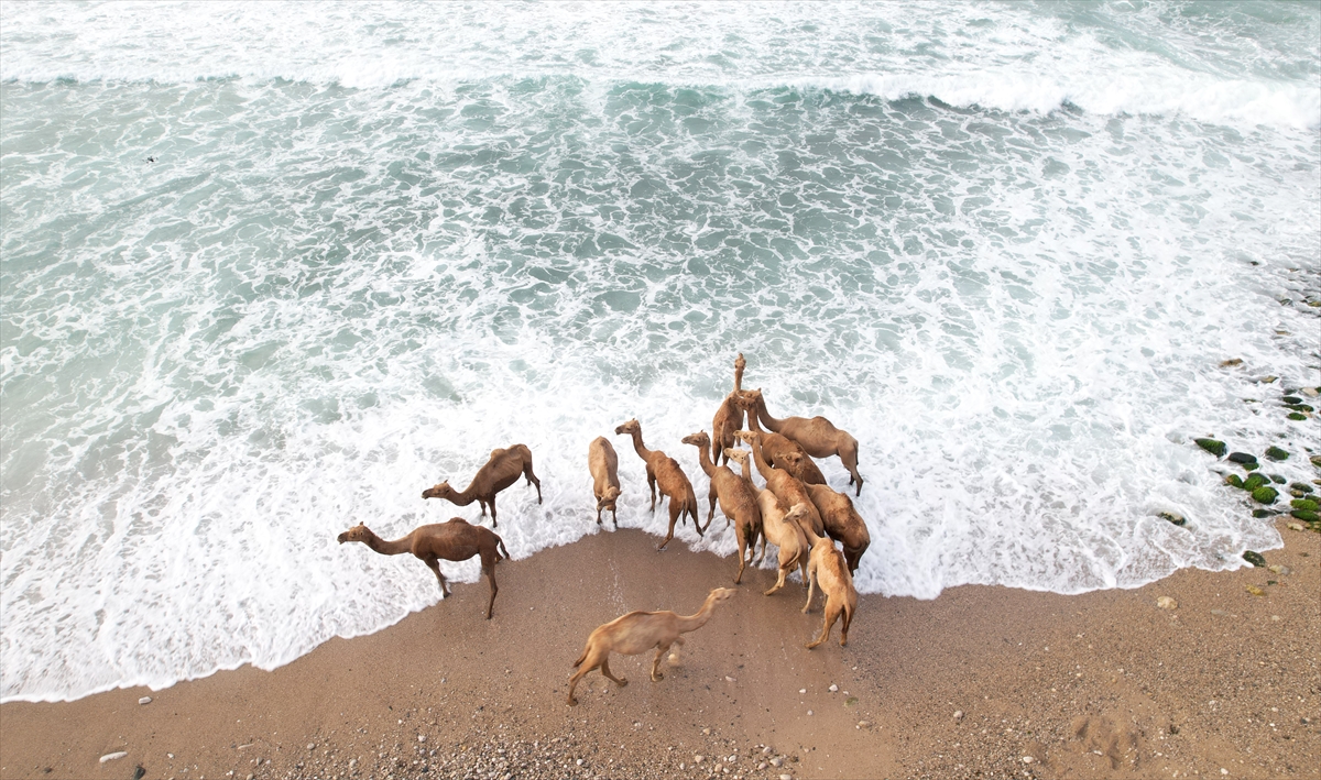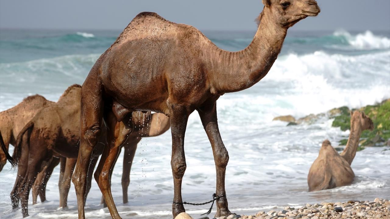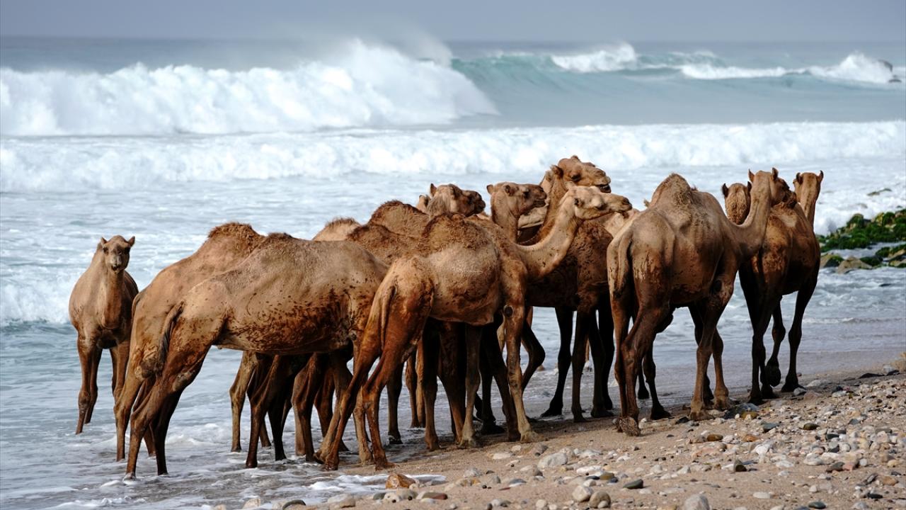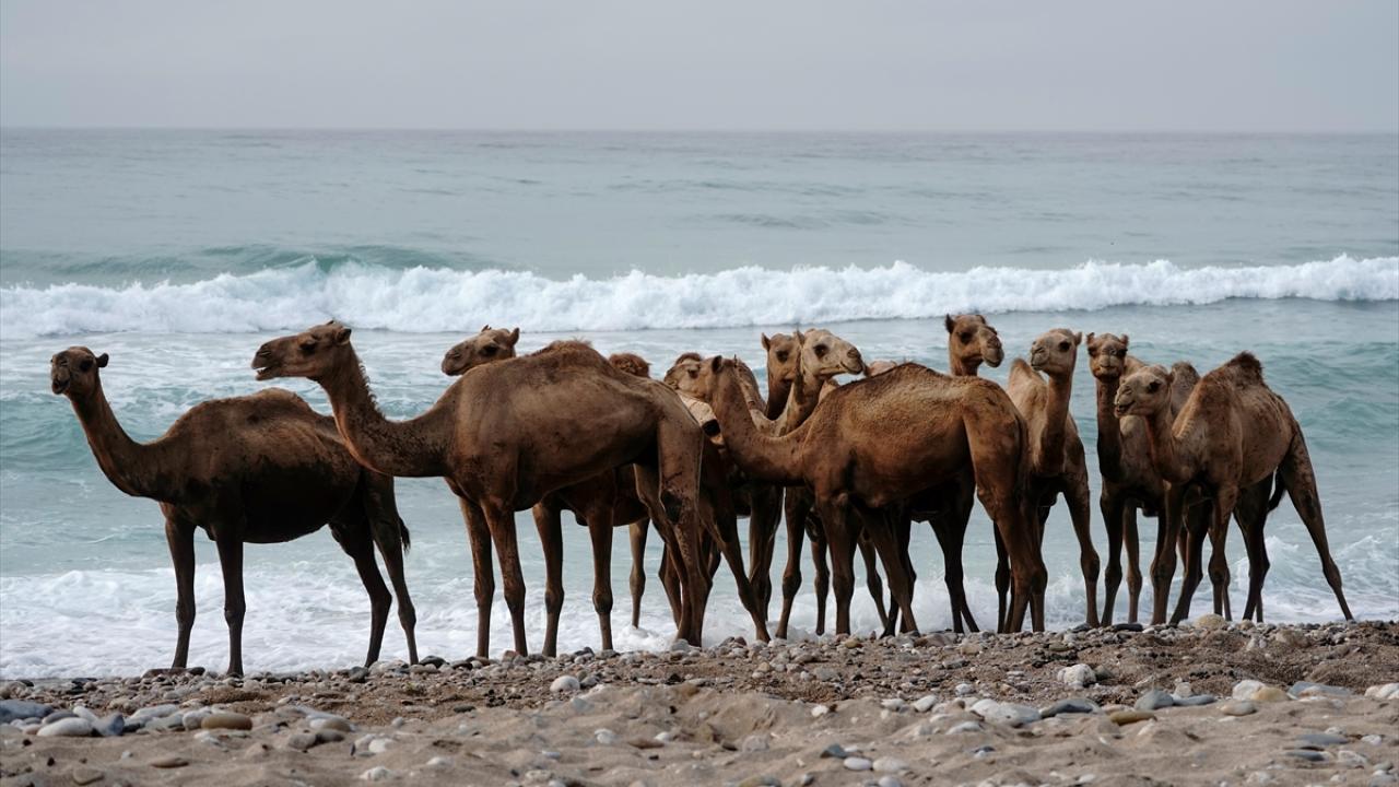 Umman'ın Zufar ilindeki yüksek alanlarda yaşayan develer, sıcak hava ve sivrisinekler nedeniyle yazın serin sulara ulaşmak için sahil şeritlerine seyahat ediyor.
