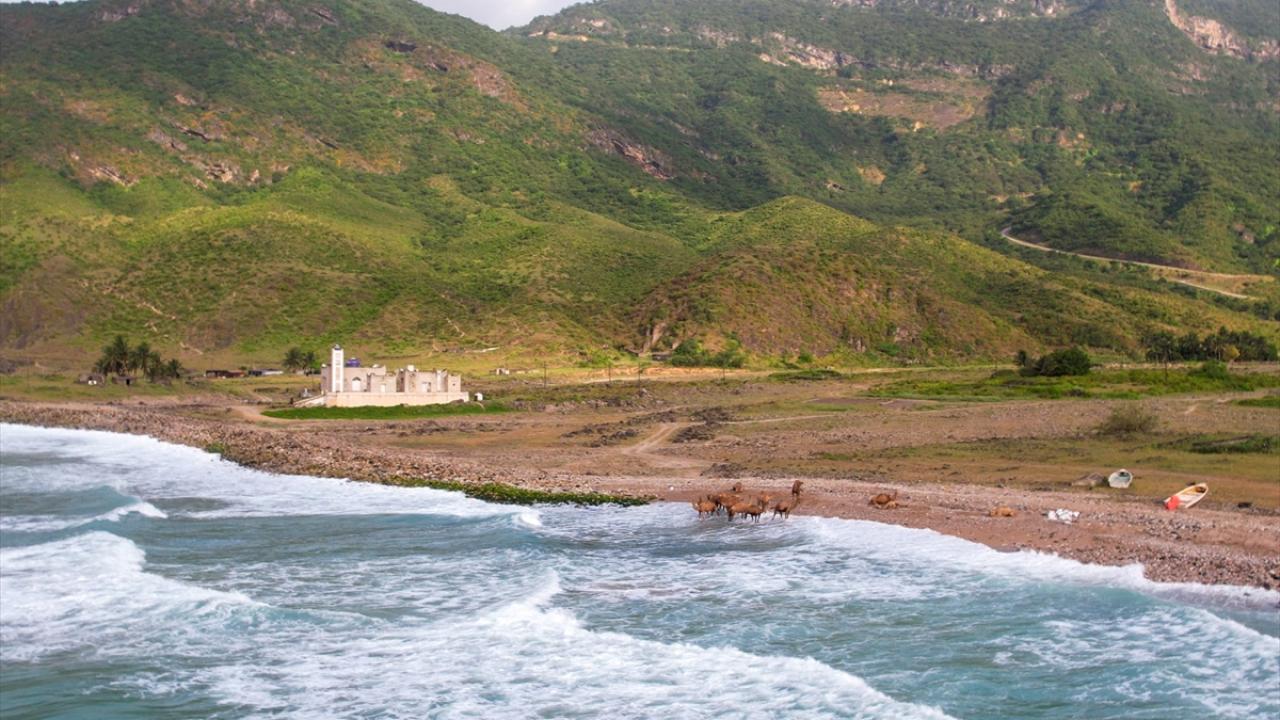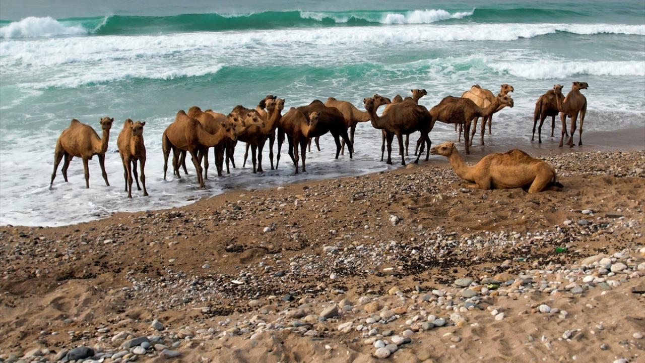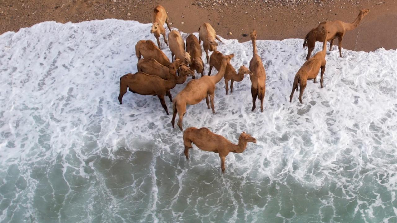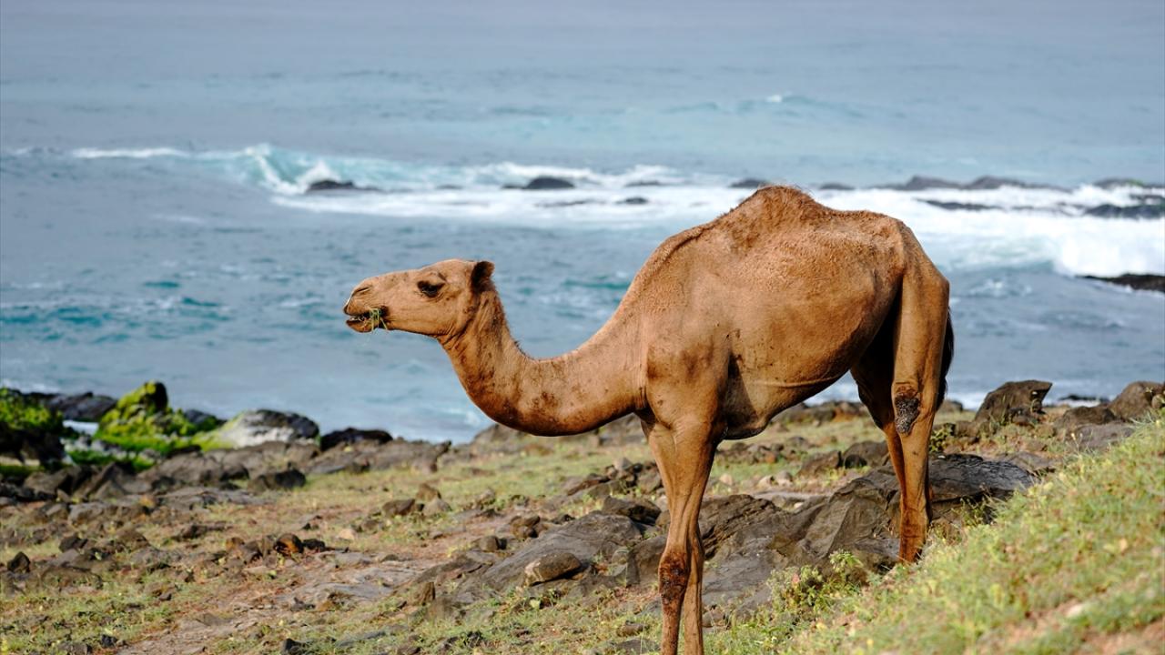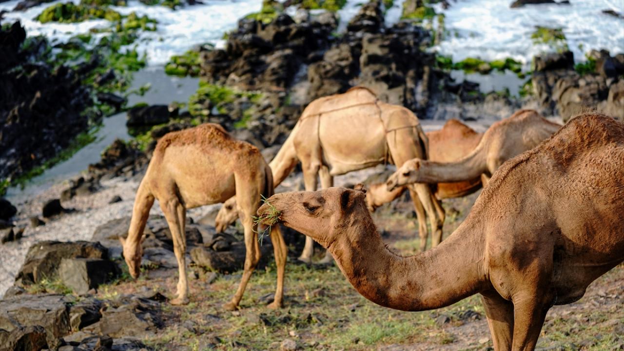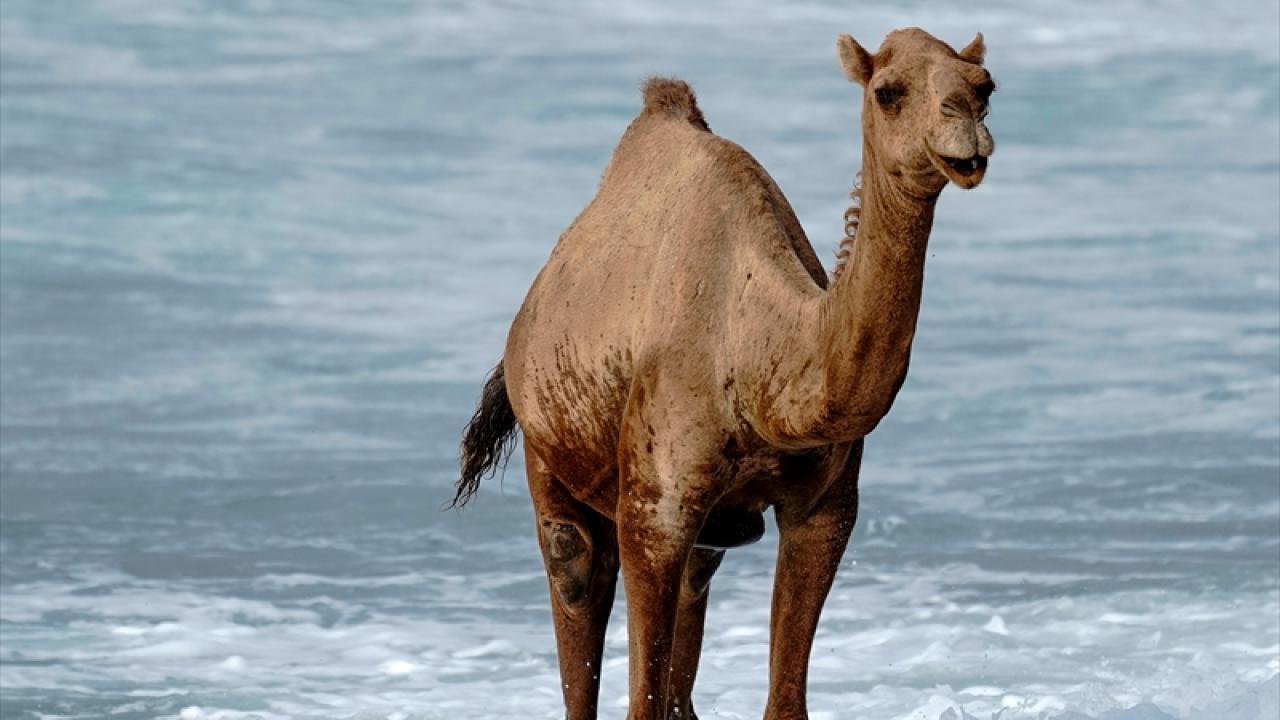 Umman'ın Zufar ilindeki yüksek alanlarda yaşayan develer, sıcak hava ve sivrisinekler nedeniyle yazın serin sulara ulaşmak için sahil şeritlerine seyahat ediyor.