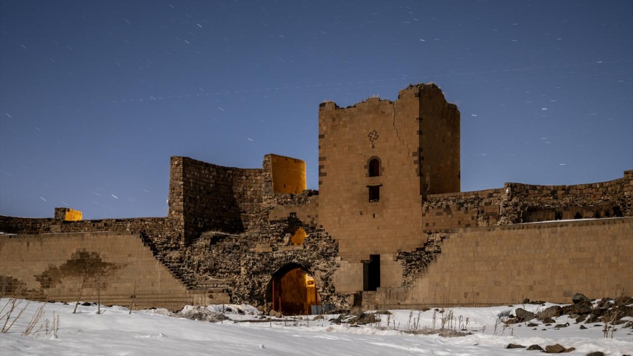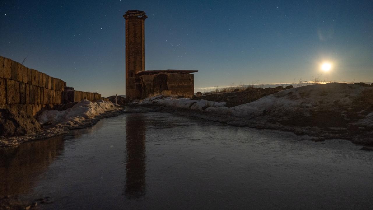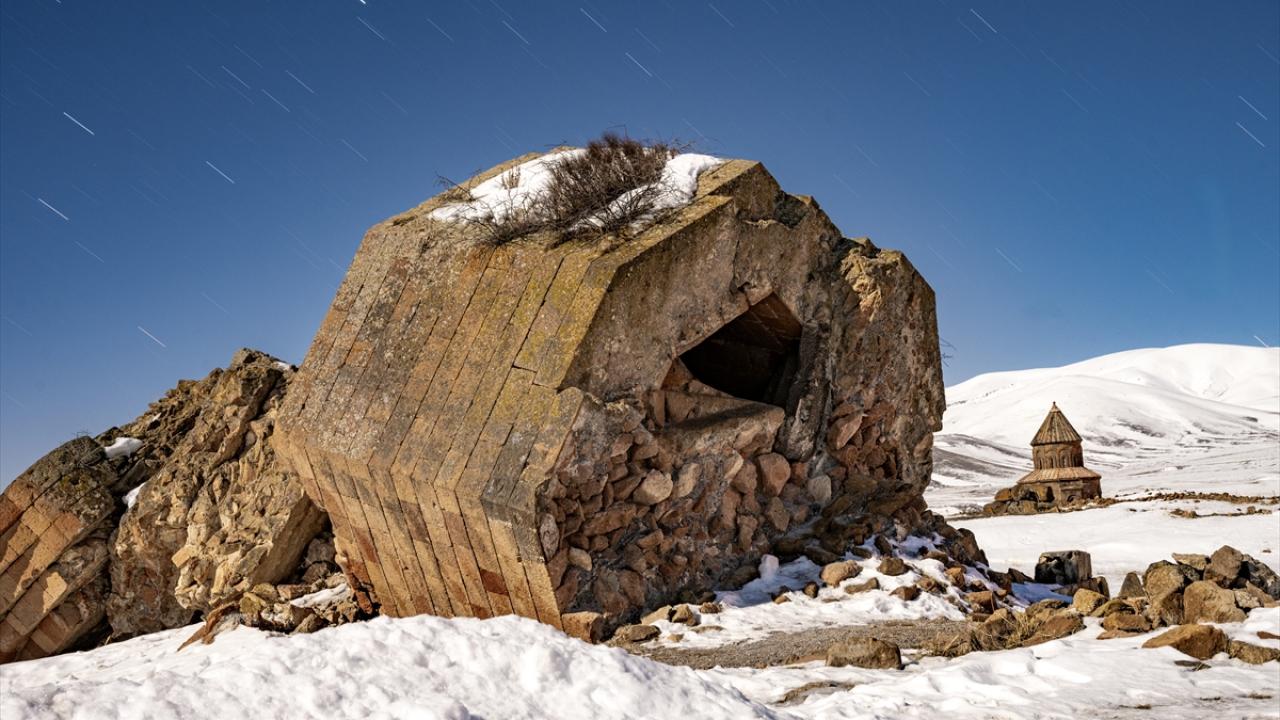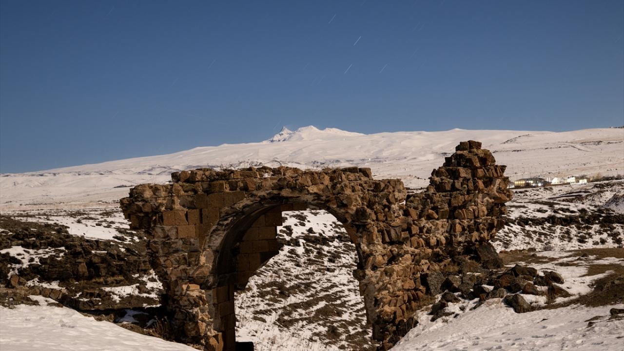 UNESCO Dünya Miras Listesi'nde yer alan Kars'taki Ani Ören Yeri, son günlerde etkili olan kar yağışıyla beyaza büründü. Karla kaplanan Ani'deki Ebul Menucehr Camisi, yıldız pozlama tekniğiyle görüntülendi.