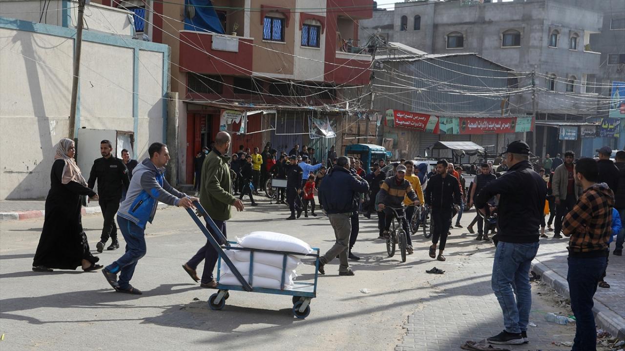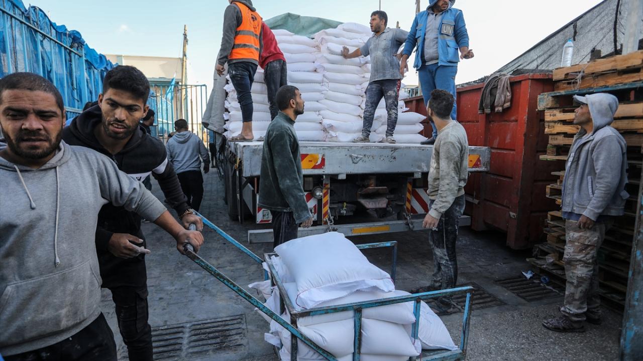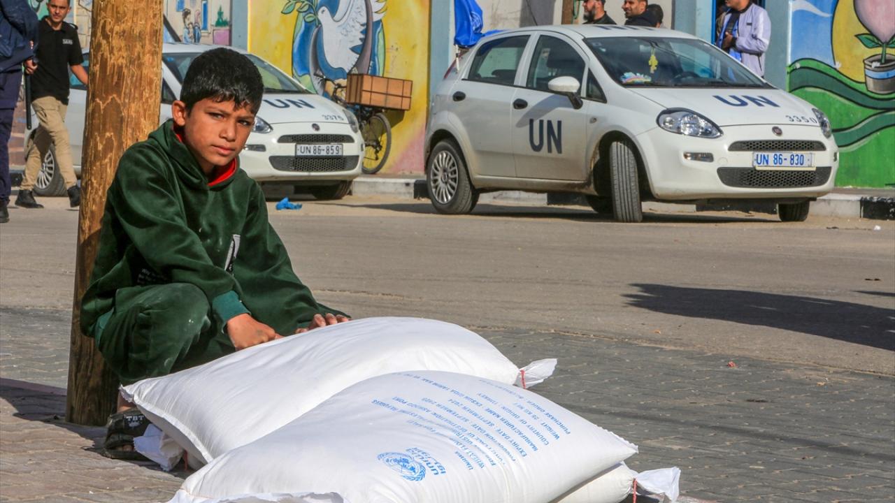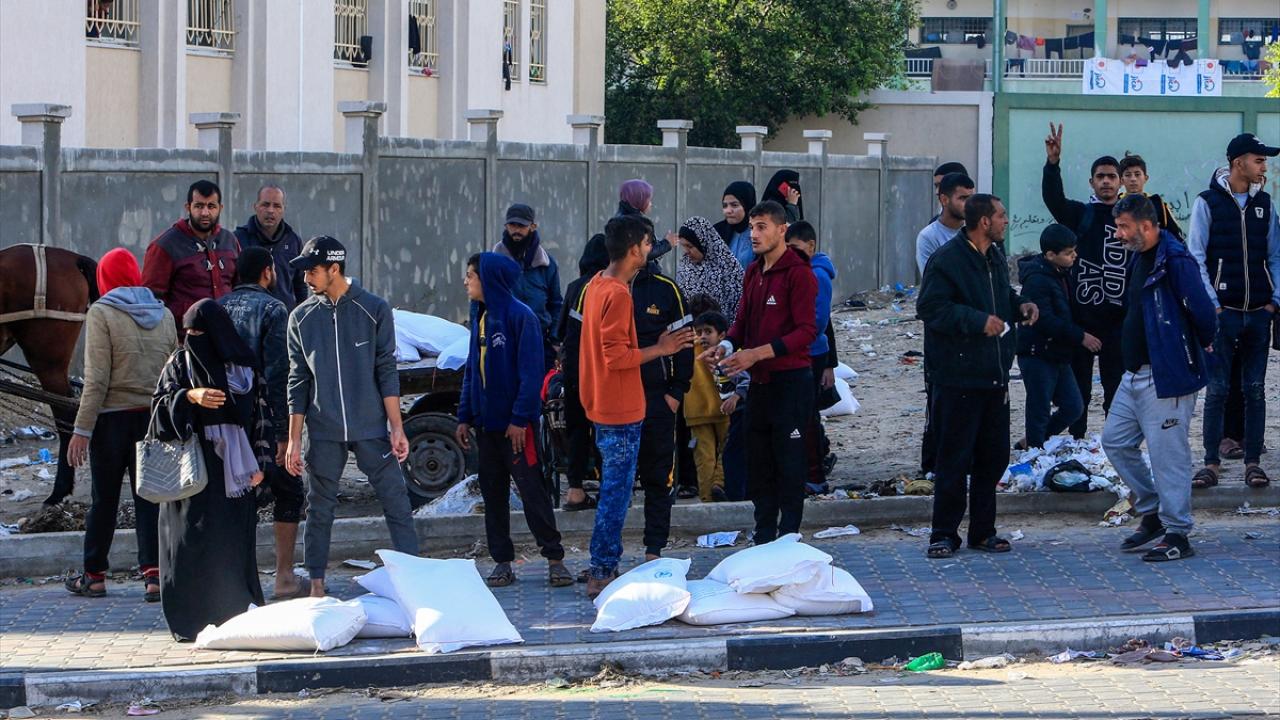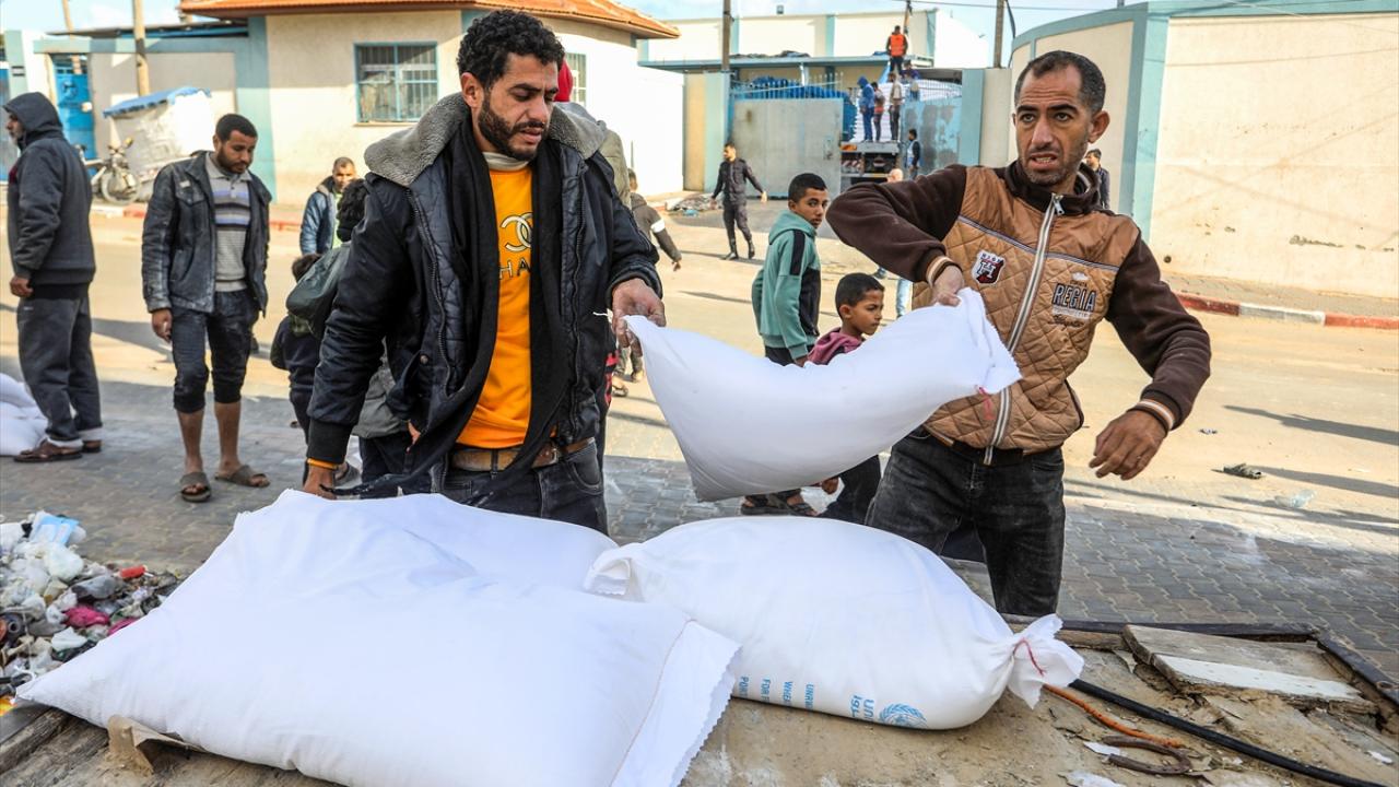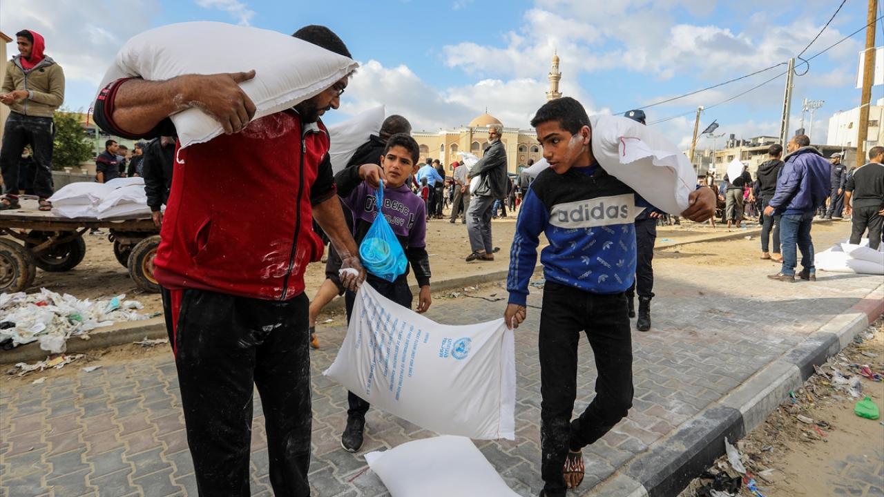 BM Filistinli Mültecilere Yardım Ajansı (UNRWA) tarafından evlerinden olan Gazzelilere, Refah kentinde un dağıtımı yaptı.