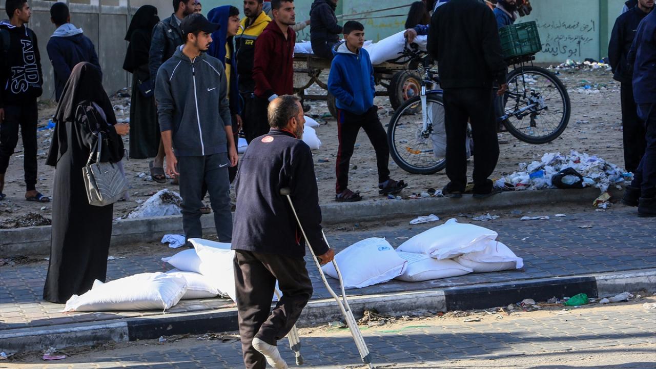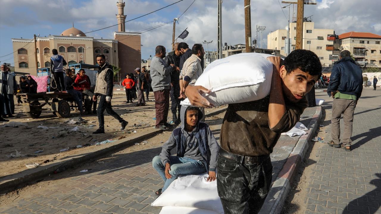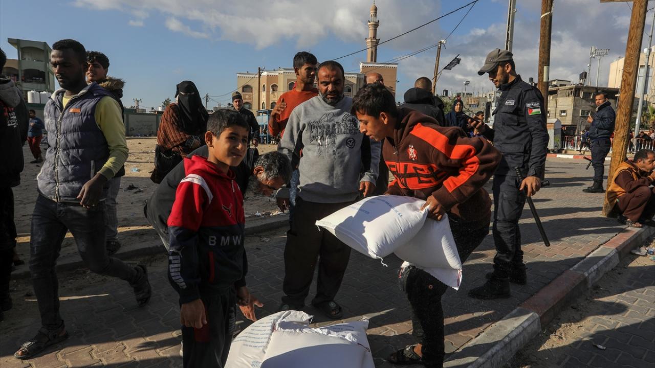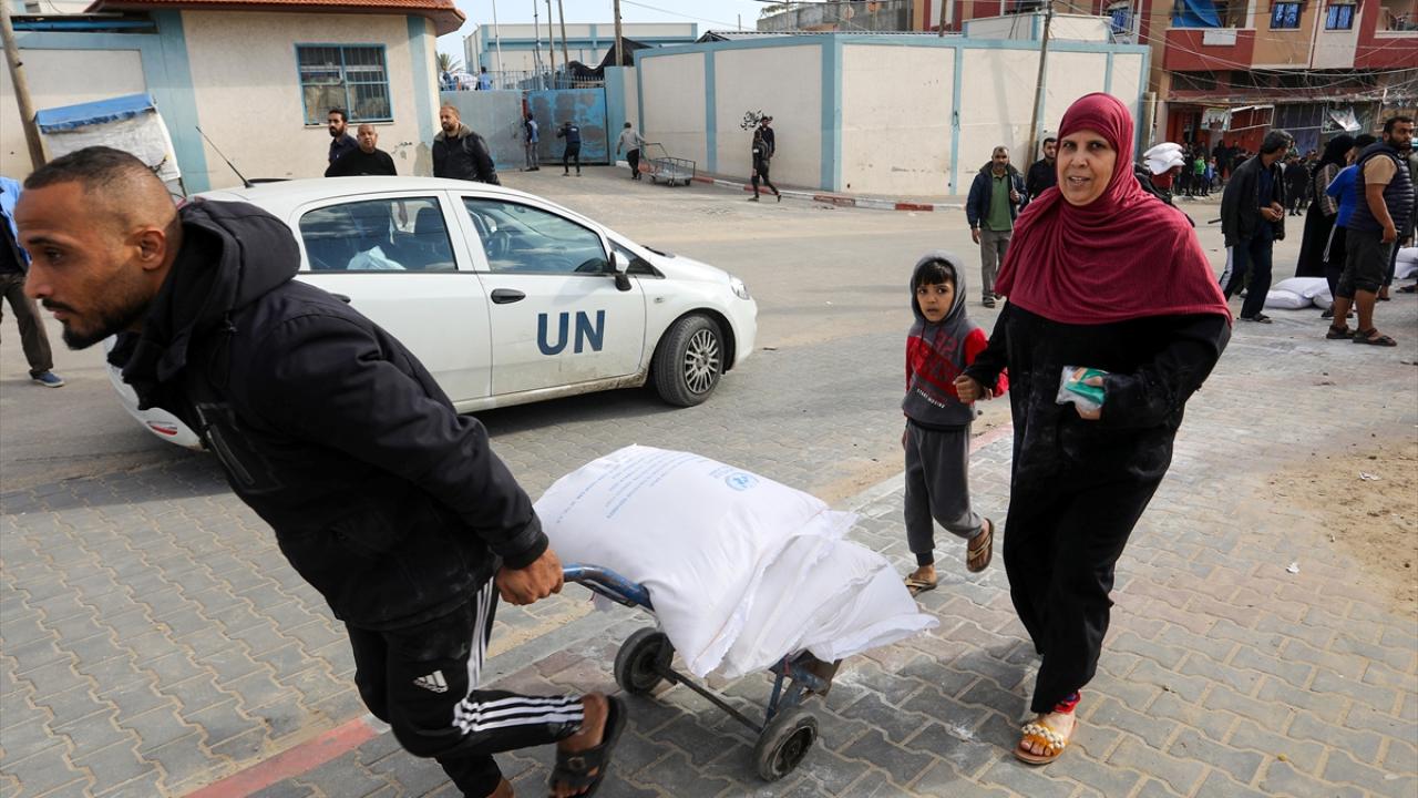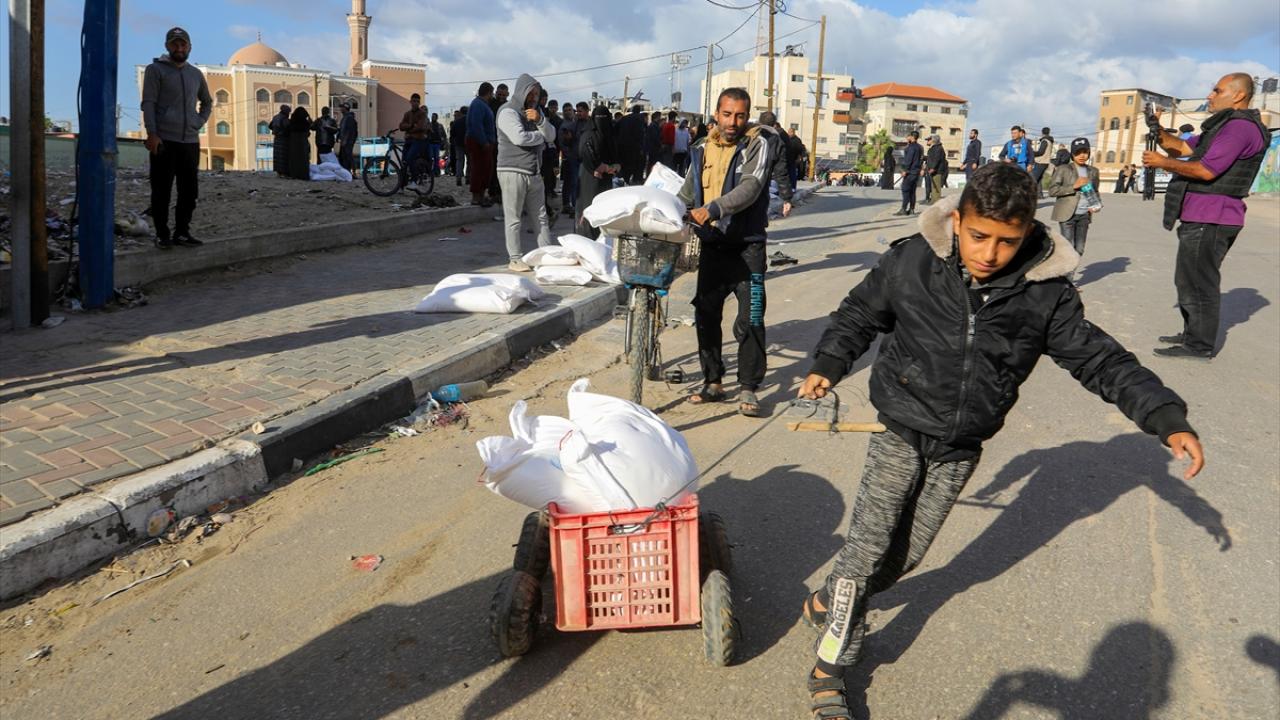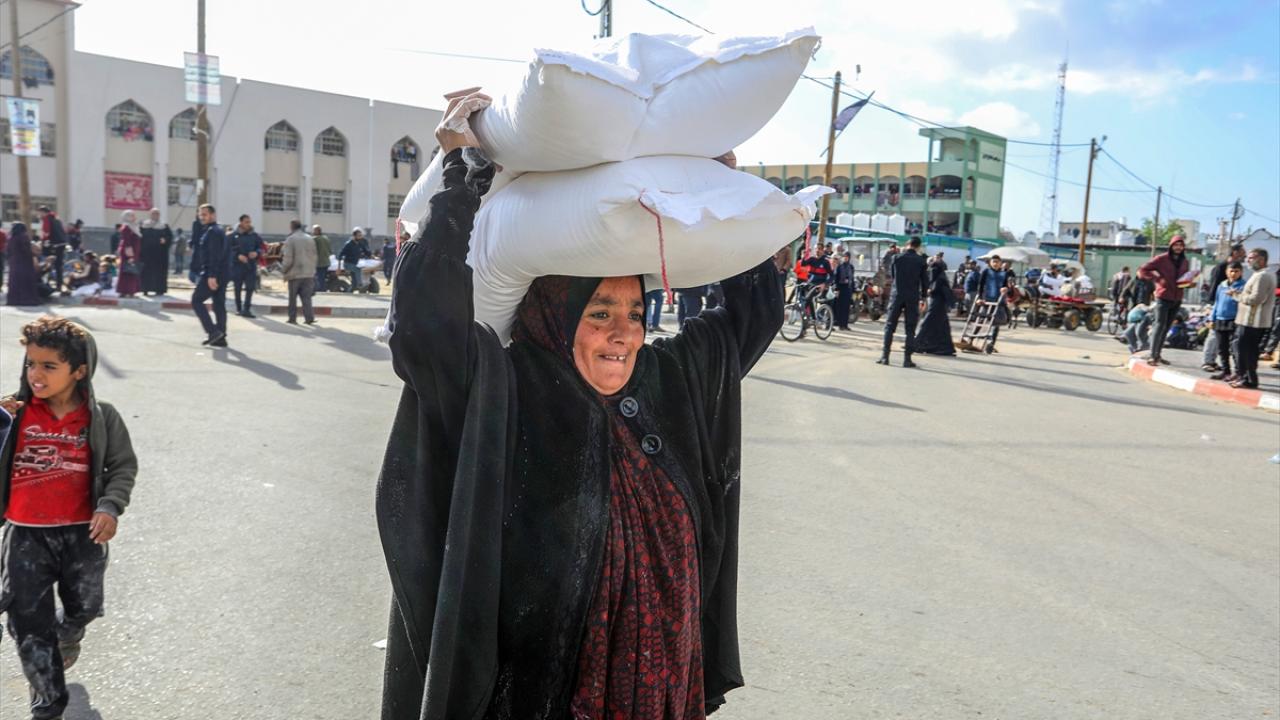 BM Filistinli Mültecilere Yardım Ajansı (UNRWA) tarafından evlerinden olan Gazzelilere, Refah kentinde un dağıtımı yaptı.