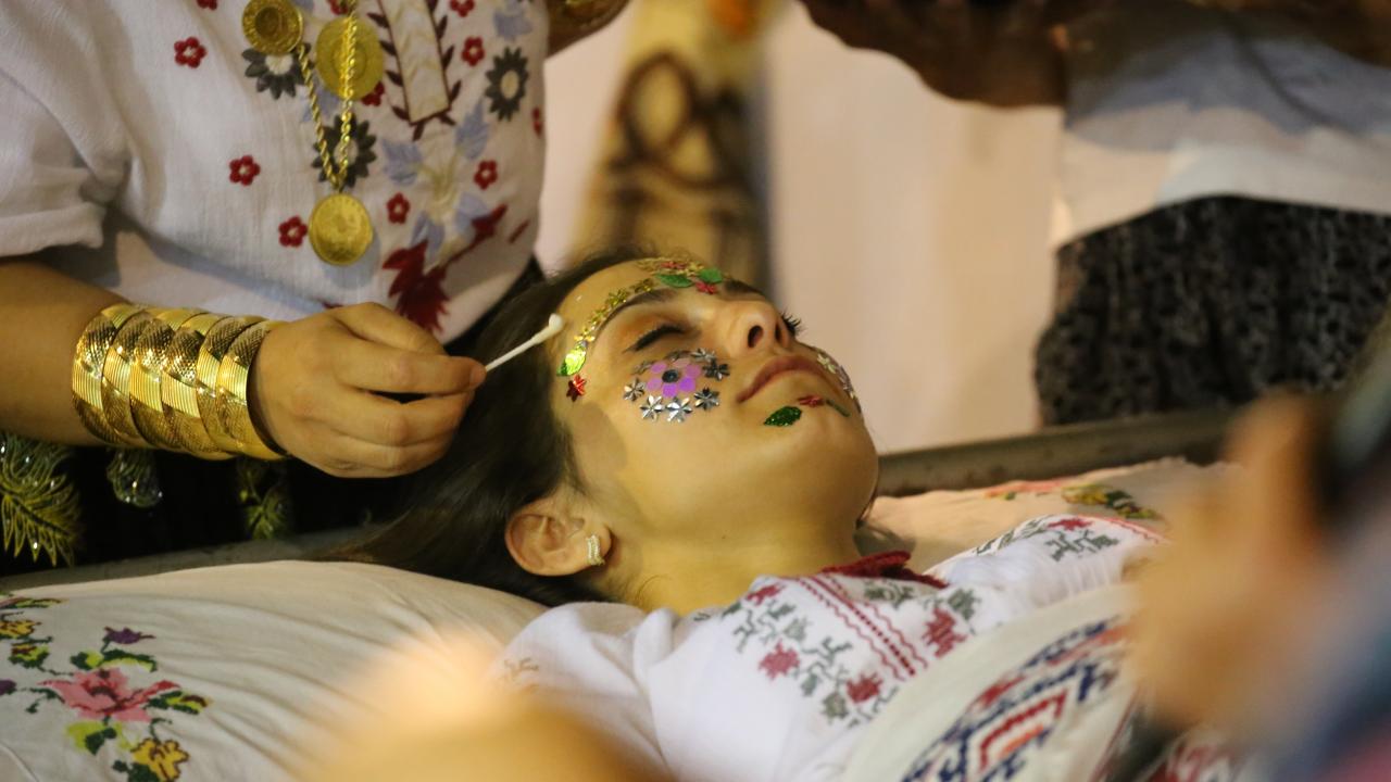 Kutlamaya gelen konukların alınları pullarla süslendi ardından görümce "tellaçka" sıfatıyla Meryem Pelin tarafından gelin Deniz Şentürk’ün alnı ve yüzü pullarla süslendi.