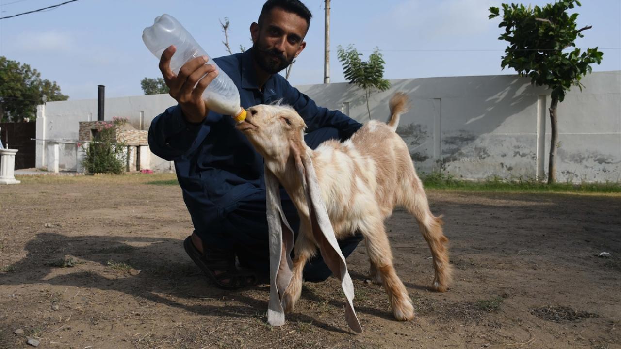 Simbi’nin sahibi Mohammad Hasan Narejo, beslenmesinin ardından yavru keçinin ağzını peçeteyle süt artıklarından temizliyor, uzamaya başlayan yünlerini fön tarağıyla düzeltiyor.